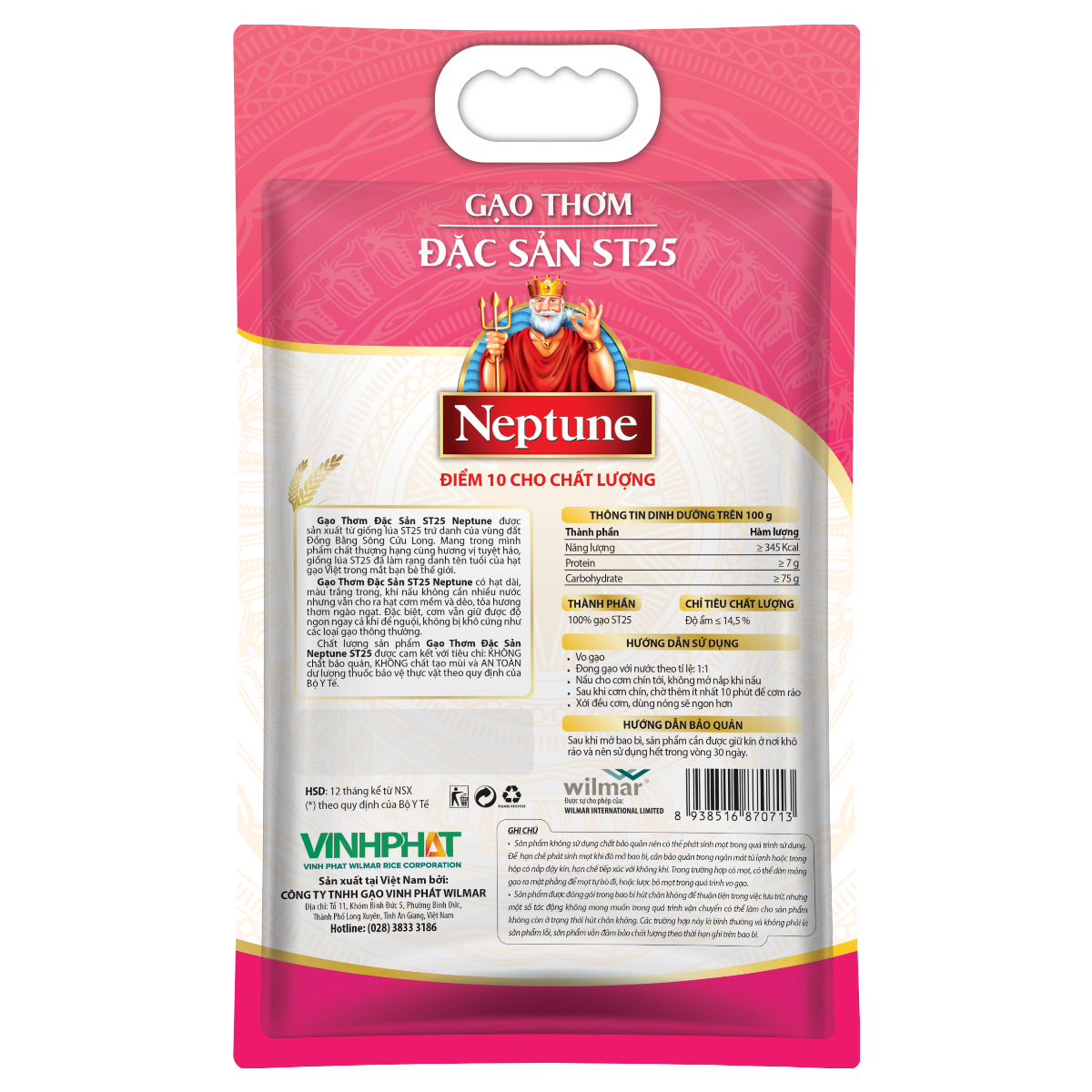 Gạo thơm đặc sản ST25 Neptune túi 5kg Gạo thơm ST25 Neptune túi 5kg là sự kết hợp giữa giống lúa ST25 trứ danh của vùng đất Đồng Bằng Sông Cửu Long và quy trình
