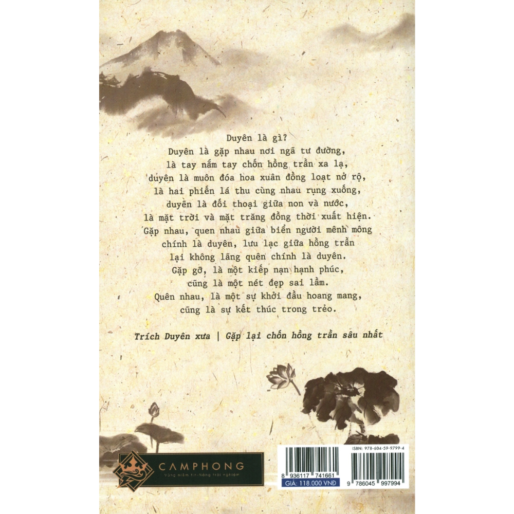 Gặp Lại Chốn Hồng Trần Sâu Nhất (Tái Bản) "Duyên là gì? Duyên là gặp nhau nơi ngã tư đường, là nắm tay chốn hồng trần xa lạ; duyên là muôn đóa hoa xuân đồng loạt nở rộ, là hai phiến lá thu cùng nhau rụng xuống; duyên là đối thoại giữa non và nước, là mặt trời và mặt trăng đồng thời xuất hiện. Gặp nhau, quen nhau giữa biển người mênh mông chính là duyên, lưu lạc giữa hồng trần lại không lãng quên chính là duyên. Gặp gỡ, là một kiếp nạn hạnh phúc, cũng là một nét đẹp sai lầm. Quên nhau, là một sự khởi đầu hoang mang, cũng là sự kết thúc trong trẻo." (Trích Duyên xưa)