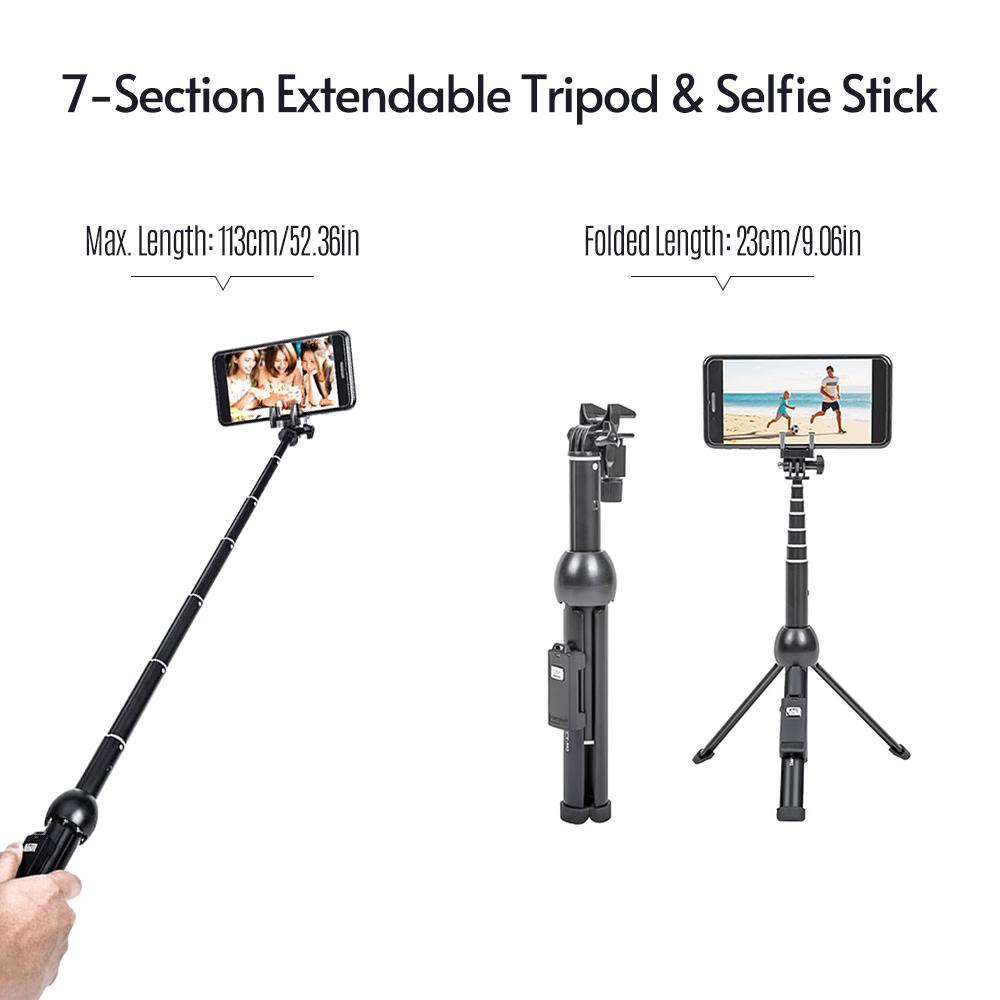 Features: 2 in 1 Dual Use: Phone selfie stick and tripod stand functions integrated as one, change it into another condition in seconds whenever you want. 7-section Extendable: The stick has 7 sections for extendable