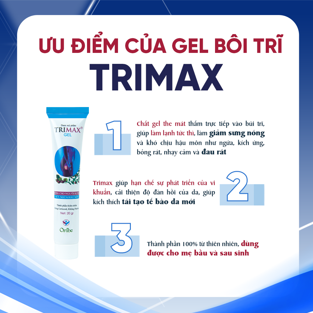 Mua tại TiktokTrimax là gel bôi trĩ được kết hợp bởi các thành phần thảo mộc, an toàn và hiệu quả cho người bị trĩ. Thành phần không chứa Corticoid hay Paraben không gây hại cho người dùng. Gel Trimax được xem là giải pháp hoàn hảo và tiện lợi cho người bệnh trĩ nhằm làm giảm các triệu chứng sưng, nóng, đỏ, ngứa, đau rát khó chịu, đồng thời mang lại cảm giác dễ chịu và thoải mái cho người bệnh.