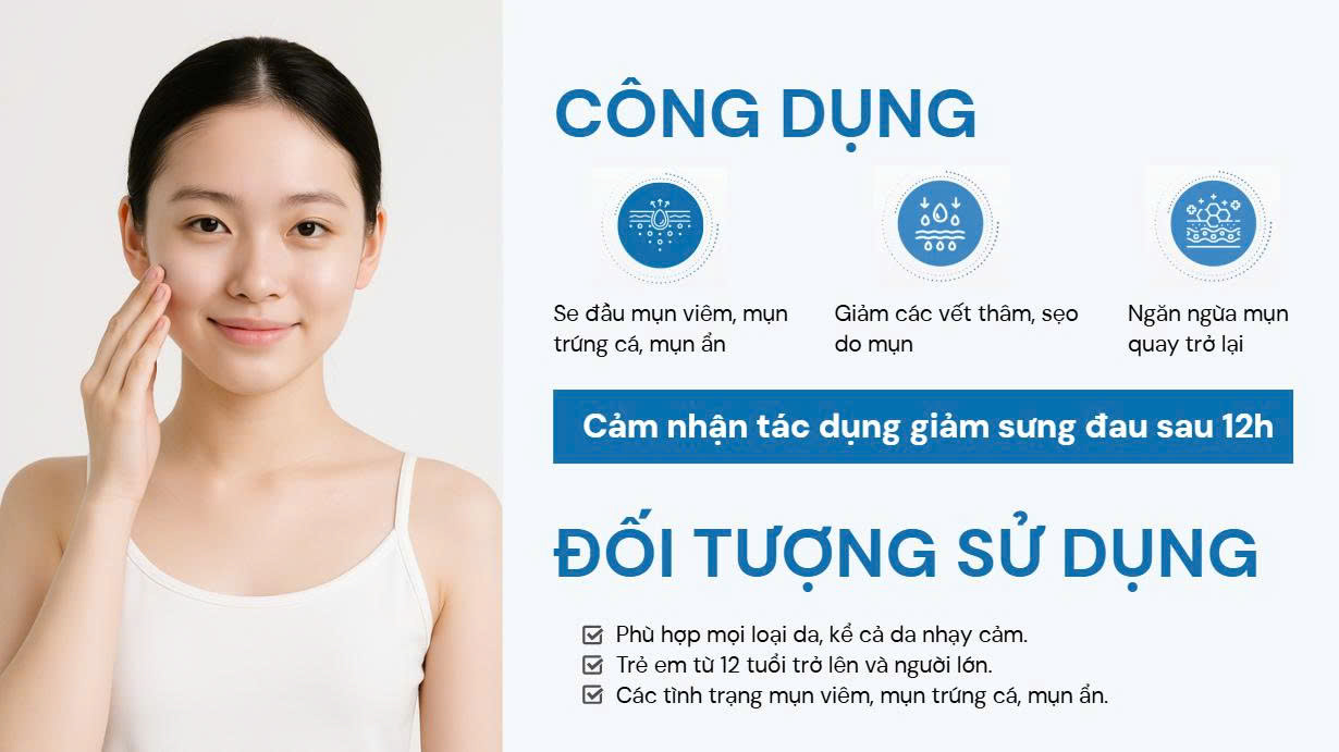 - Se đầu mụn, làm khô nhân mụn nhanh chóng, đặc biệt với mụn viêm, mụn trứng cá, mụn ẩn.