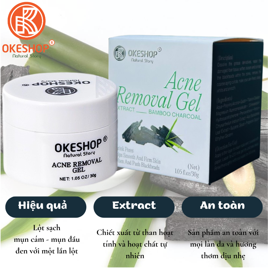 Gel lột mụn OKESHOP được sản xuất trên công nghệ tiên tiến của đài loan, với sản phẩm Kem lột mụn tinh chất Lô Hội và Than Tre chứa các thành phần thiên nhiên giúp thẩm thấu làm sạch sâu bề mặt da và lỗ chân lông, nhổ sạch các loại mụn cám, mụn đầu đen, bạ nhờn, tế bào chết, cùng các lớp sừng nằm sát dưới bề mặt da mà mắt thường khó có thể thấy được, giúp da sạch bóng láng mịn, không còn mụn và đồng thời thành phần hoạt chất có trong gel giúp thu nhỏ lỗ chân lông và giảm các tác nhân gây mụn mủ, mụn bọc, mụn cám, mụn đầu đen.