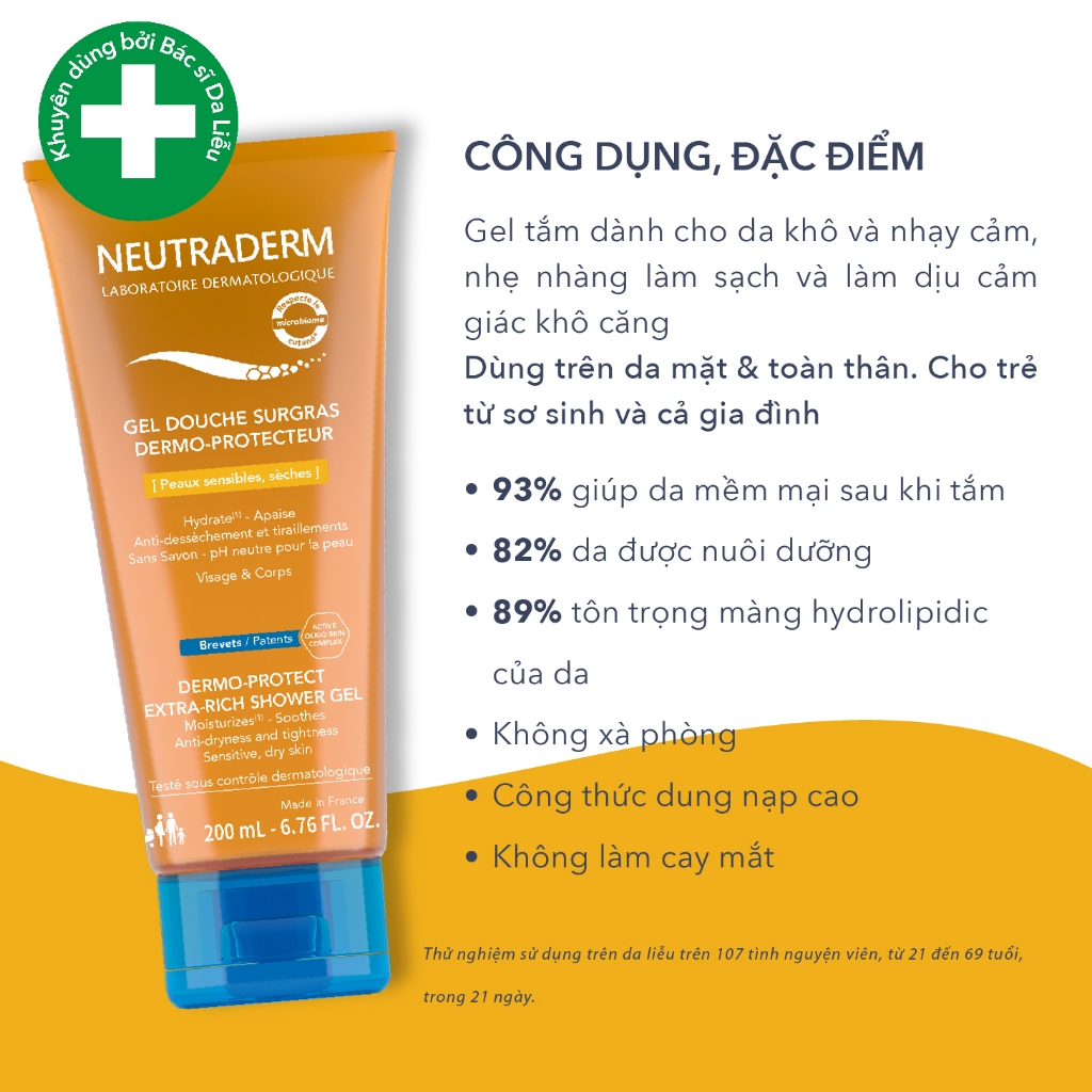 Gel Tắm Chăm Sóc Da Khô NEUTRADERM EXTRA RICH NEU Cách dùng: Đổ vài giọt vào tay và tạo bọt, nhẹ nhàng rửa sạch da mặt, da cơ thể và mái tóc của trẻ. Rửa sạch
