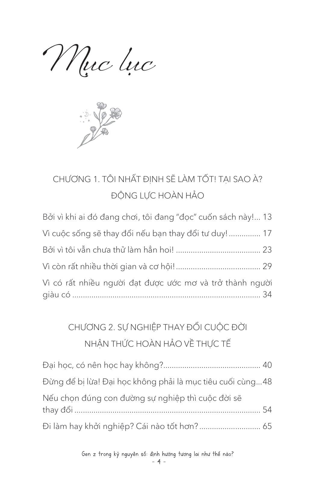 Trong cuốn sách Gen Z trong kỷ nguyên số: Định hướng tương lai như thế nào?, tác giả Yun Kyu Hoon thông qua những cuộc nói chuyện với hơn 330.000 thanh thiếu niên tại các trường trung học sẽ chỉ cho bạn thấy cách làm thế nào để vạch ra một con đường sự nghiệp tương lai đúng đắn dù bạn đã có đam mê hay chưa tìm ra. Việc định hướng này rất quan trọng, đặc biệt trong tình hình cả thế giới đang đối mặt với đại dịch covid và sự thay đổi chóng mặt do nền công nghiệp 4.0 mang lại. Những tư duy nào nên có, những nghề nghiệp nào nên được ưu tiên, những kỹ năng nào cần đào sâất cả đều đang chờ bạn lật mở cuốn sách này để khám phá.