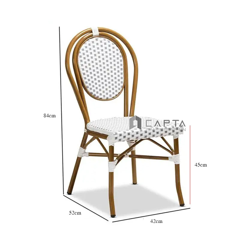 Ghế cafe nhà hàng CC2035A Nội thất Capta Ghế ngoài trời caro trắng xám tựa lưng tròn oval khung nhôm sơn tĩnh điện - Chất liệu: Khung nhôm, nệm nhựa dây đan - Kích thước: