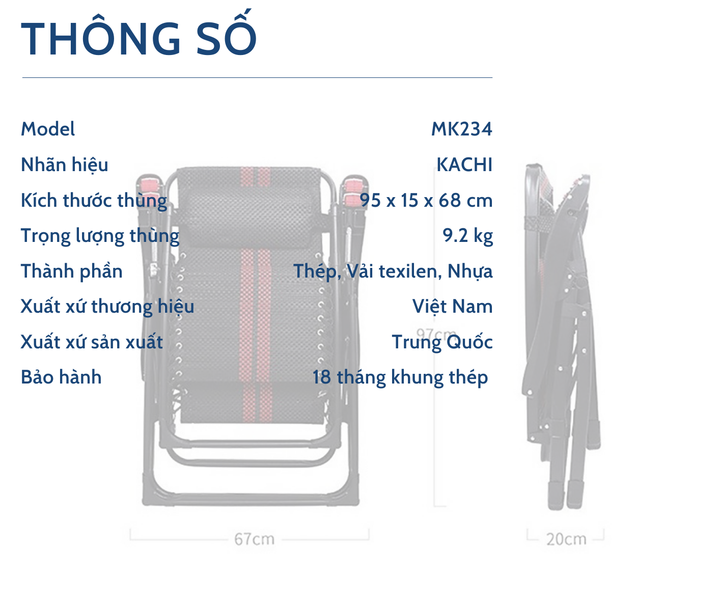 Kích thước ghế xếp Kachi MK234 lòng rộng 50cm, chiều dài duỗi ra của ghế 180cm