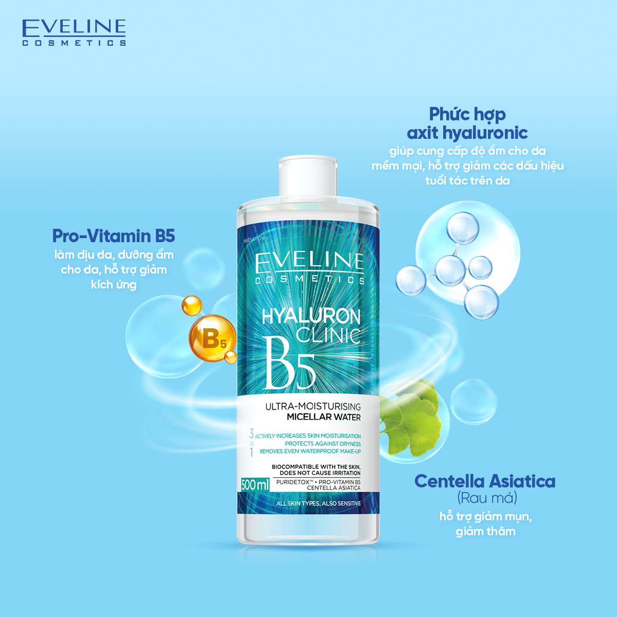 ✨[Giá Chỉ 179k] Nước tẩy trang Eveline Hyaluron Clinic B5 và tinh chất rau má hỗ trợ làm dịu, dưỡng ẩm da 500ml