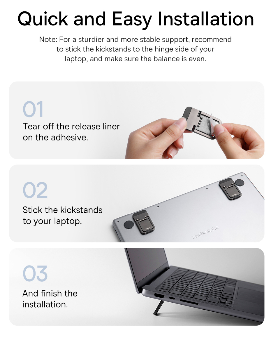 - Chất liệu hợp kim nhôm không gỉ, siêu vững, không gây kích ứng da - Thiết kế siêu mỏng, gọn, nhẹ, dán luôn ở mặt đáy của laptop, khi sử dụng chỉ cần gạt