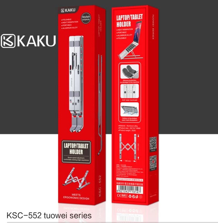 Giá đỡ đa năng KAKU dành cho Macbook iPad và các máy tính xách tay khác Chất liệu: hợp kim Nhôm (bền, đẹp, chắc chắn hơn nhựa rất nhiều) Các đầu tiếp xúc được gắn silicon êm mềm, không gây trầy xước máy Dùng để đỡ laptop các cỡ (13~15.6inch) và máy tính bảng Tương thích với hầu hết mọi Macbook/Laptop Gấp gọn khi không sử dụng có tính di động cao Linh hoạt tuỳ chỉnh độ cao theo nhiều cấp độ. Chống mỏi lưng, mỏi cổ, hạn chế các bệnh lý khi làm việc quá nhiều với máy tính. Khe thoáng giúp tản nhiệt laptop rất hiệu quả. Đệm cao su chống trơn trượt.