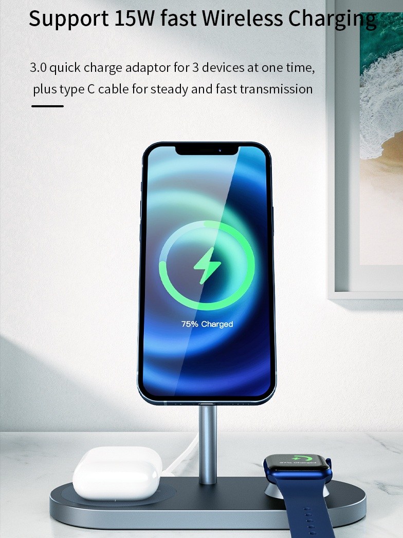 Lực hút nam châm tăng 20% so với các sản phẩm thông thường, giữ chặt thiết bị tương thích ngay cả khi di chuyển. Bạn có thể sạc ba thiết bị cùng lúc với một