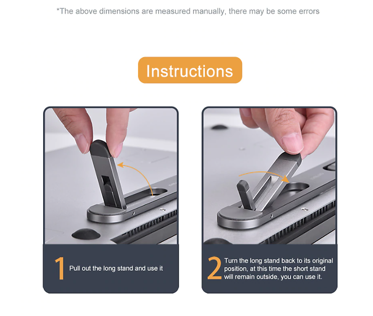 1. Material: aluminum alloy+silicone 2. Size: ≈L150×W105.4×H54.3(mm) 3. Weight: ≈300g 4.Compatible size: laptops up to 15.6-inch 5.Adjustable width: 12-26mm 6.Twist the knob, undraw the metal base, put your laptop in and push the base into