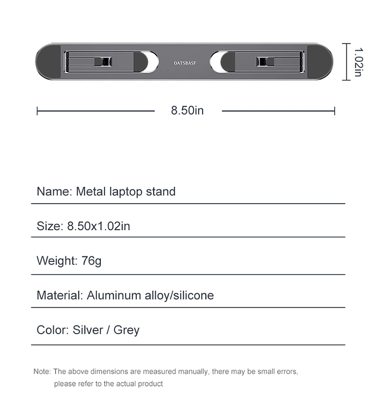 1. Material: aluminum alloy+silicone 2.Size: ≈L150×W79×H51(mm) 3.Weight: ≈176g 4.Compatible size: laptops up to 15.6-inch 5.Adjustable width: 12-26mm