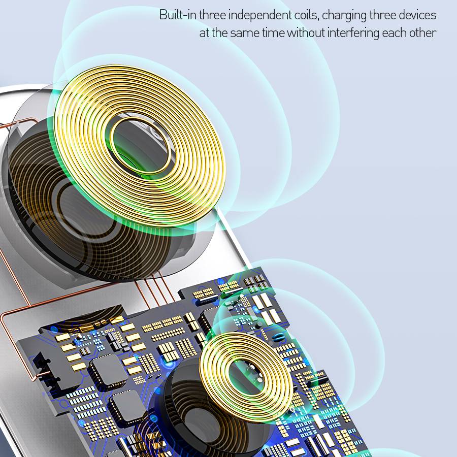 CUỘN CẢM BIẾN ĐƯỢC NÂNG CẤP Đế sạc không dây hỗ trợ nhanh không dây 15W 3 in 1 hiệu WIWU Power Air Wireless Charger PA3IN1B Cuộn cảm được thiết kế tách biệt với bộ xử lý bởi đĩa cách từ cho hiệu suất sử dụng cao hơn, an toàn hơn. Bảo vệ an toàn tuyệt đối cho thiết bị và người sử dụng. Khả năng tự động ngắt điện khi sạc đầy, giúp bảo vệ pin điện thoại, tăng tuổi thọ pin. Đạt chuẩn Qi cho sạc không dây.