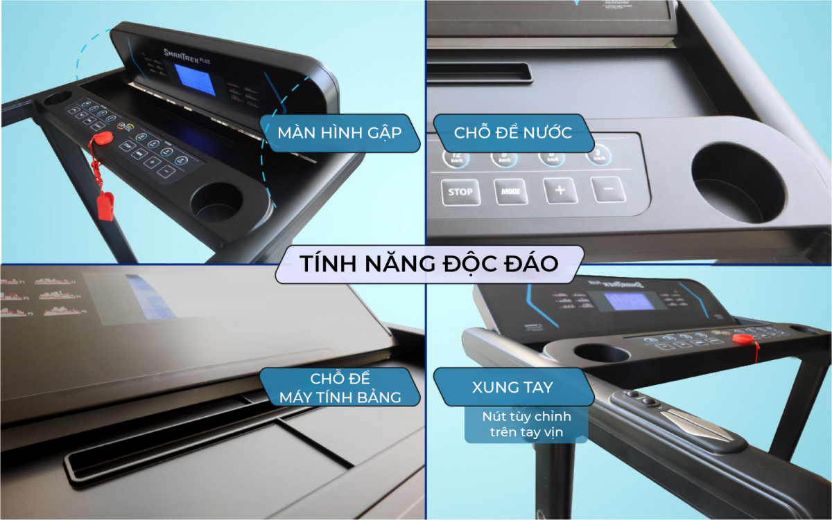 4. Thiết kế được cải tiến đa năng, tiện lợi Máy chạy bộ GINTELL SmartTrek Plus với màn hình gập mở gọn gàng đẽ thao tác cùng với hệ thống nút bấm đơn giản đẽ sử dụng. Ngoài ra máy còn có ngăn để nước và kệ đỡ tablet thông minh để bạn có thể bật nhạc và khiến buổi luyện tập thêm phần thú vị.