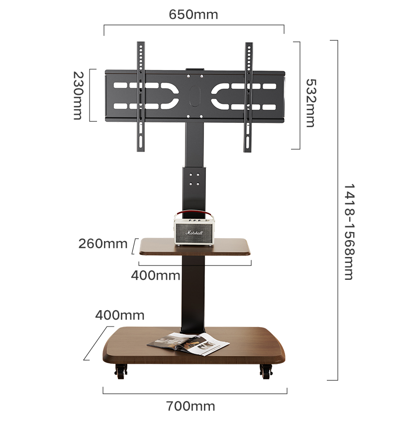 Tên sản phẩm: Giá treo tivi di động có kệ để đồ GM173 Kích thước tổng: Dài 70cm - Rộng 40cm - Cao 156cm Chất liệu: Khung thép chống gỉ phủ sơn tĩnh - Kệ gỗ MDF phủ melamine chống xước Màu sắc: Khung đen - Kệ gỗ nâu óc chó Công năng: Là mẫu giá treo tivi di động kèm kệ để đồ tiện lợi phù hợp nhiều không gian như phòng khách, phòng ngủ, phòng họp, phòng cộng đồng, ...