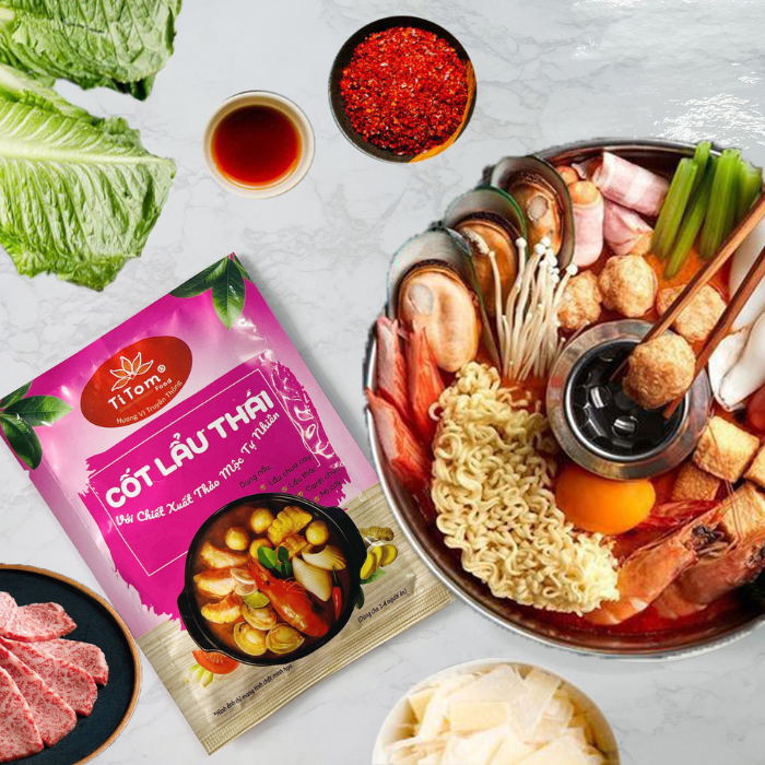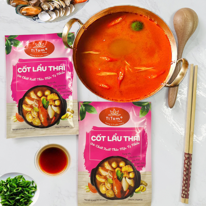 - HƯỚNG DẪN SỬ DỤNG -Dùng nấu nước cốt lẩu thái hoặc làm gia vị nấu mì cay, gia vị canh chua, gia vị lẩu chua cay. -Bước 1: Phi thơm hành tím, tỏi. Tiếp tục cho thêm sả, thơm (khóm), cà chua vào xào sơ. -Bước 2: Cho 1.5 lít nước và 1 gói Cốt lẩu thái Titom vào, hòa tan. Tùy theo khẩu vị mà tăng giảm lượng nước và nêm nếm cho phù hợp. -Bước 3: Thêm tôm, mực, cá, rau vào và đun sôi, nấu chín nguyên liệu. Ăn kèm bún hoặc mì.