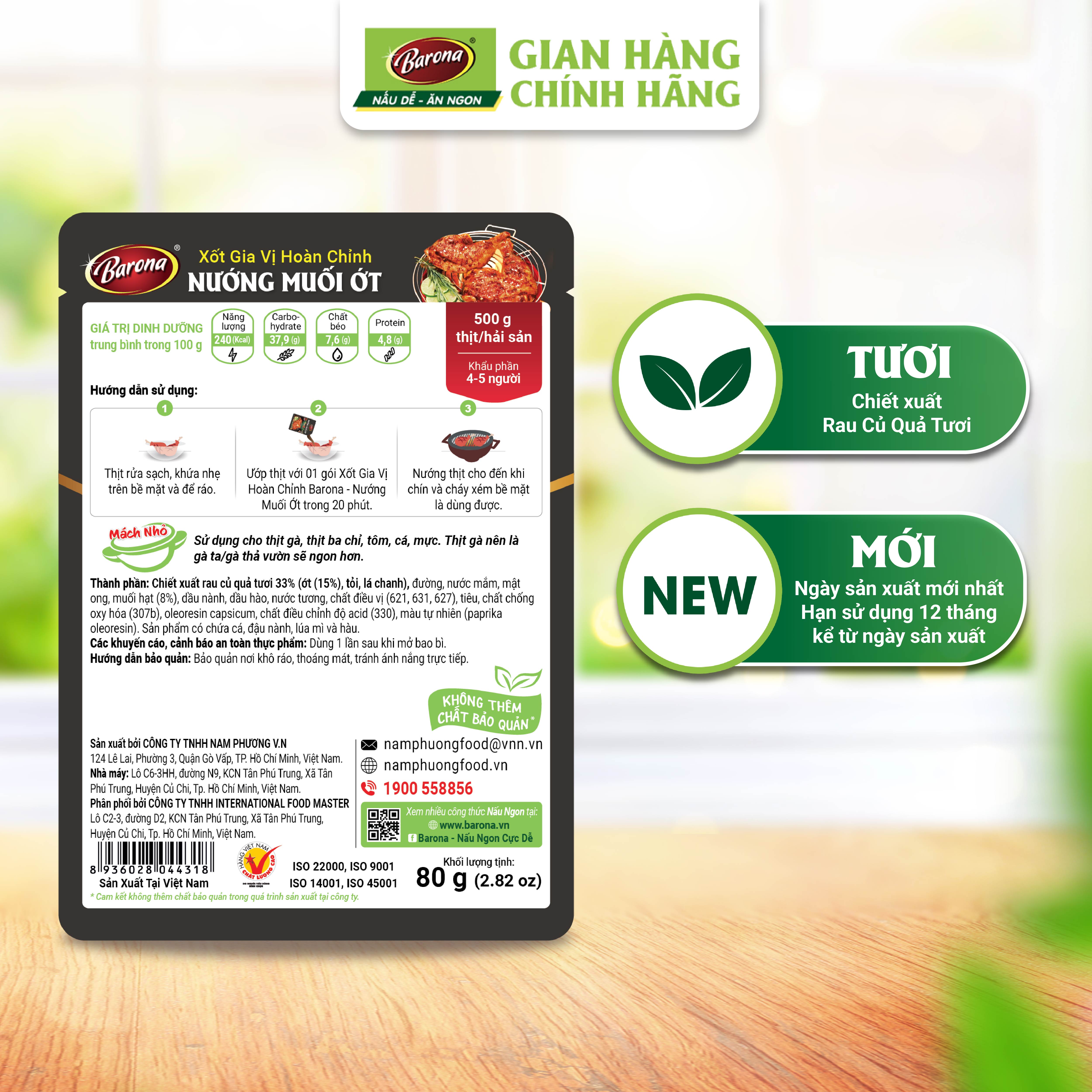 XỐT GIA VỊ HOÀN CHỈNH BARONA NƯỚNG MUỐI ỚT 80G Xốt Gia Vị Hoàn Chỉnh Barona là công thức phối trộn độc đáo giữa CHIẾT XUẤT RAU CỦ QUẢ TƯƠI như hành, tỏi, me, cà
