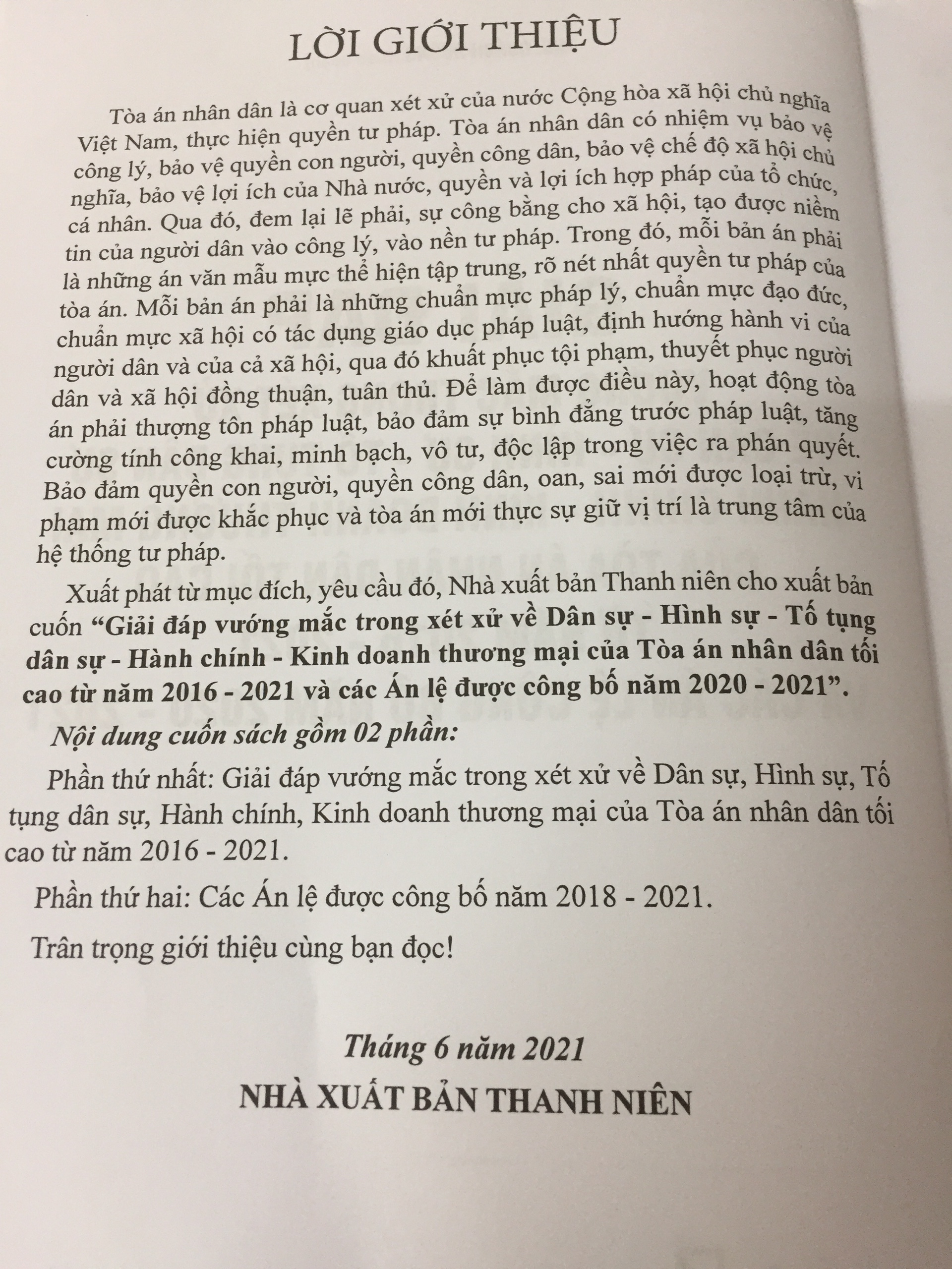 Giải đáp vướng mắc trong xét xử về Dân sự, Hình sự, Tố tụng dân sự Hành chính, Kinh doanh thương mại của Tòa án nhân dân tối cao từ năm 2016 - 2021 và các Án lệ được công bố năm 2020 - 2021     Nhà xuất bản: Thanh Niên Tác giả: ThS. Quách Dương (Chủ biên) Phát hành: 6.2021 Sách khổ: 19x27cm Số trang: 436. Giá bìa: 380.000đ   Tòa án nhân dân là cơ quan xét xử của nước Cộng hòa xã hội chủ nghĩa Việt Nam, thực hiện quyền tư pháp. Tòa án nhân dân có nhiệm vụ bảo vệ công lý, bảo vệ quyền con người, quyền công dân, bảo vệ chế độ xã hội chủ nghĩa, bảo vệ lợi ích của Nhà nước, quyền và lợi ích hợp pháp của tổ chức, cá nhân.Qua đó, đem lại lẽ phải, sự công bằng cho xã hội, tạo được niềm tin của người dân vào công lý, vào nền tư pháp. Trong đó, mỗi bản án phải là những án văn mẫu mực thể hiện tập trung, rõ nét nhất quyền tư pháp của tòa án. Mỗi bản án phải là những chuẩn mực pháp lý, chuẩn mực đạo đức, chuẩn mực xã hội có tác dụng giáo dục pháp luật, định hướng hành vi của người dân và của cả xã hội, qua đó khuất phục tội phạm, thuyết phục người dân và xã hội đồng thuận, tuân thủ. Để làm được điều này, hoạt động tòa án phải thượng tôn pháp luật, bảo đảm sự bình đẳng trước pháp luật, tăng cường tính công khai, minh bạch, vô tư, độc lập trong việc ra phán quyết.Bảo đảm quyền con người, quyền công dân, oan, sai mới được loại trừ, vi phạm mới được khắc phục và tòa án mới thực sự giữ vị trí là trung tâm của hệ thống tư pháp. Xuất phát từ mục đích, yêu cầu đó, Nhà xuất bản Thanh niên cho xuất bản cuốn “Giải đáp vướng mắc trong xét xử về Dân sự, Hình sự, Tố tụng dân sự Hành chính, Kinh doanh thương mại của Tòa án nhân dân tối cao từ năm 2016 - 2021 và các Án lệ được công bố năm 2020 - 2021”. Nội dung cuốn sách gồm 02 phần: Phần thứ nhất: Giải đáp vướng mắc trong xét xử về Dân sự, Hình sự, Tố tụng dân sự, Hành chính, Kinh doanh thương mại của Tòa án nhân dân tối cao từ năm 2016 - 2021. Phần thứ hai: Các Án lệ được công bố năm 2018 - 2021. Trân trọng giới thiệu cùng bạn đọc! , , , ,