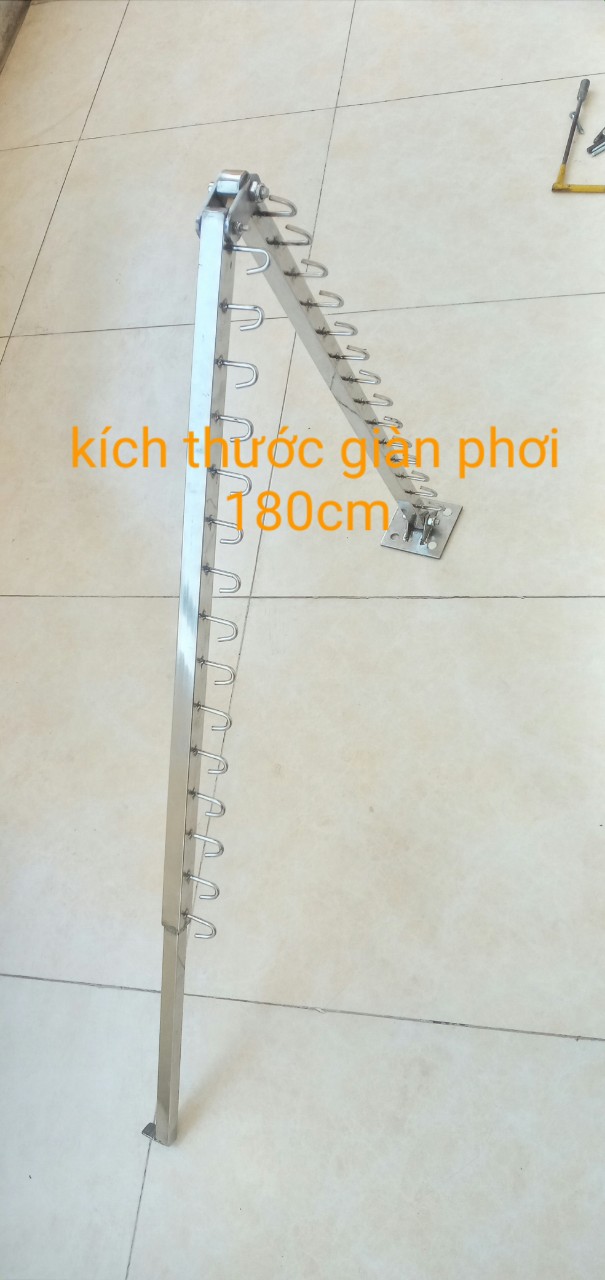 cty inox khởi hòa chúng tôi chuyên sx các sp về inox với dòng sp giá phơi quần áo có kích thước 180 cm tải trọng tối đa cho sp là 45kg ,sp được sx như sau                                                                               1..../ mặt bích inox dày 5mm được đột 4 lỗ bắt vít vào tường (sp kèm theo 4 vít lục giác và nở nhựa)  2.../ thanh mắc áo được làm bằng hộp 2,5x2,5 cm inox dày 1.2mm                                                    3     móc treo quần áo được làm bằng cây inox đặc 5mm                                                                      4     toàn bộ thanh được kết nối bằng ốc lục giác inox 100% ,                                                                5     giàn phơi có thể lắp đặt tại ban công ,sân vườn ,cạnh cửa sổ vvv