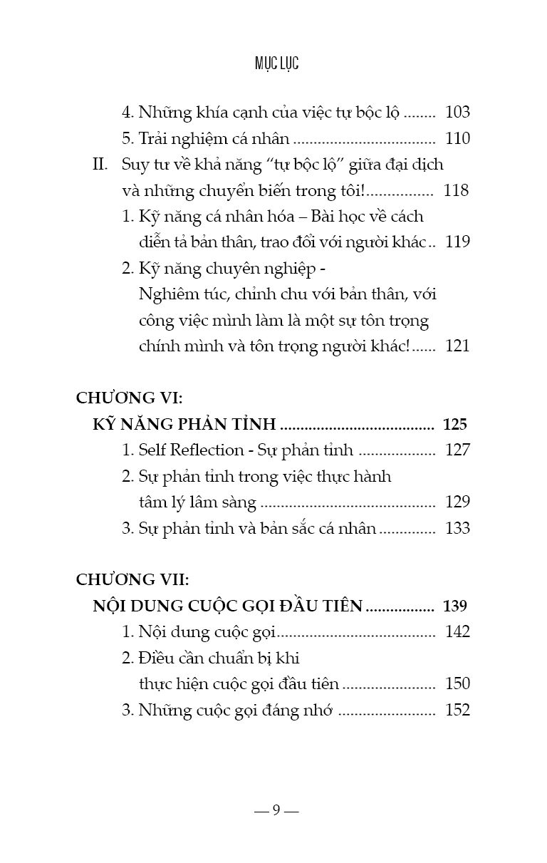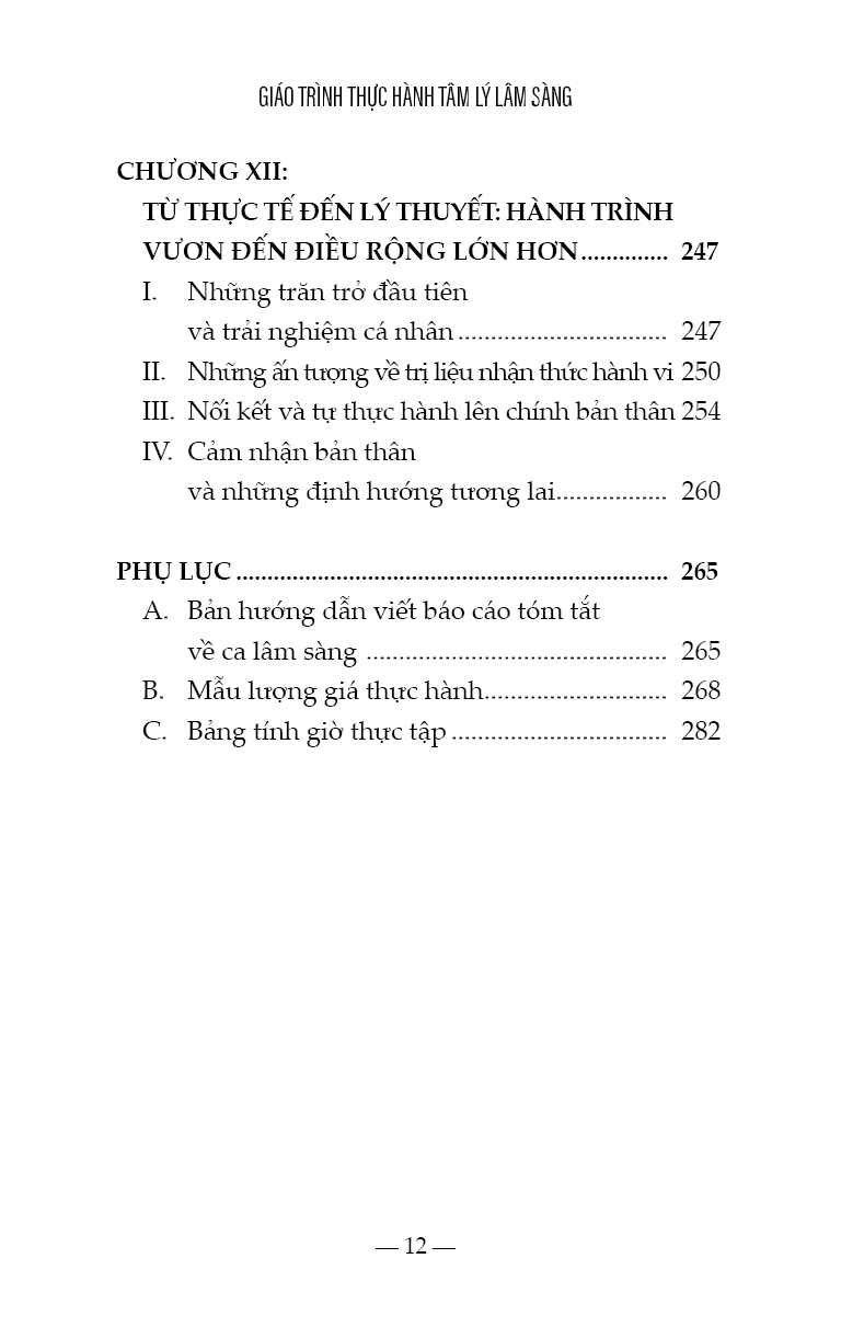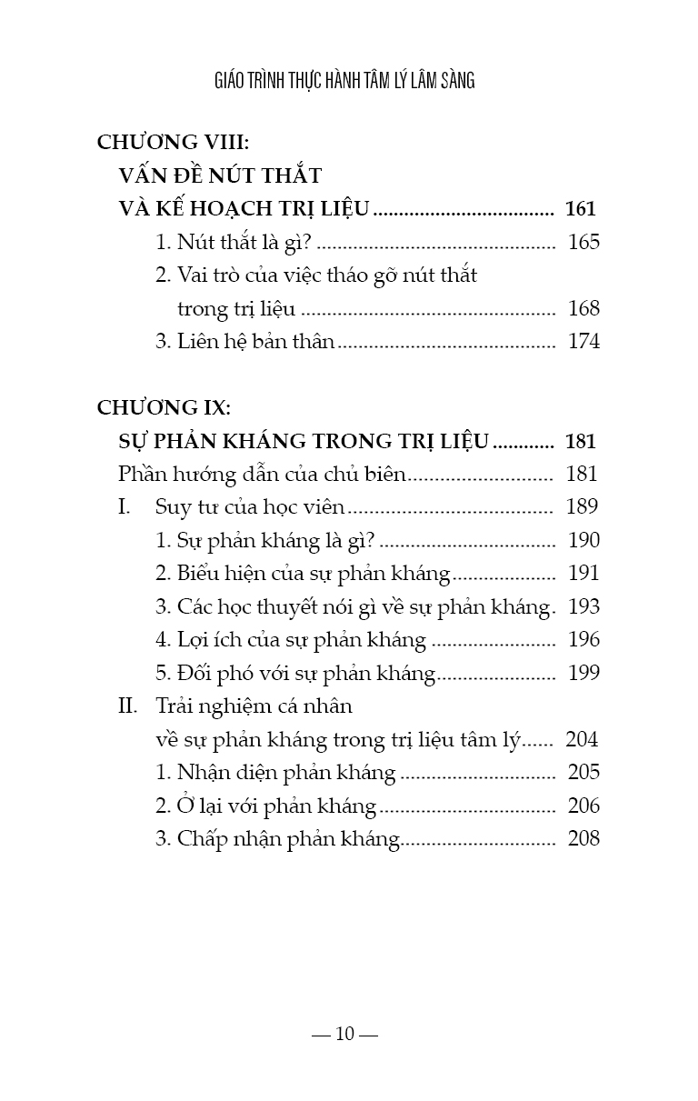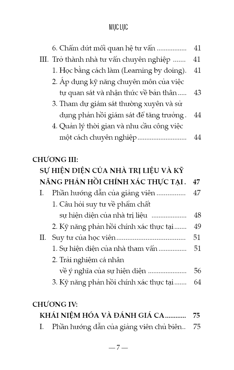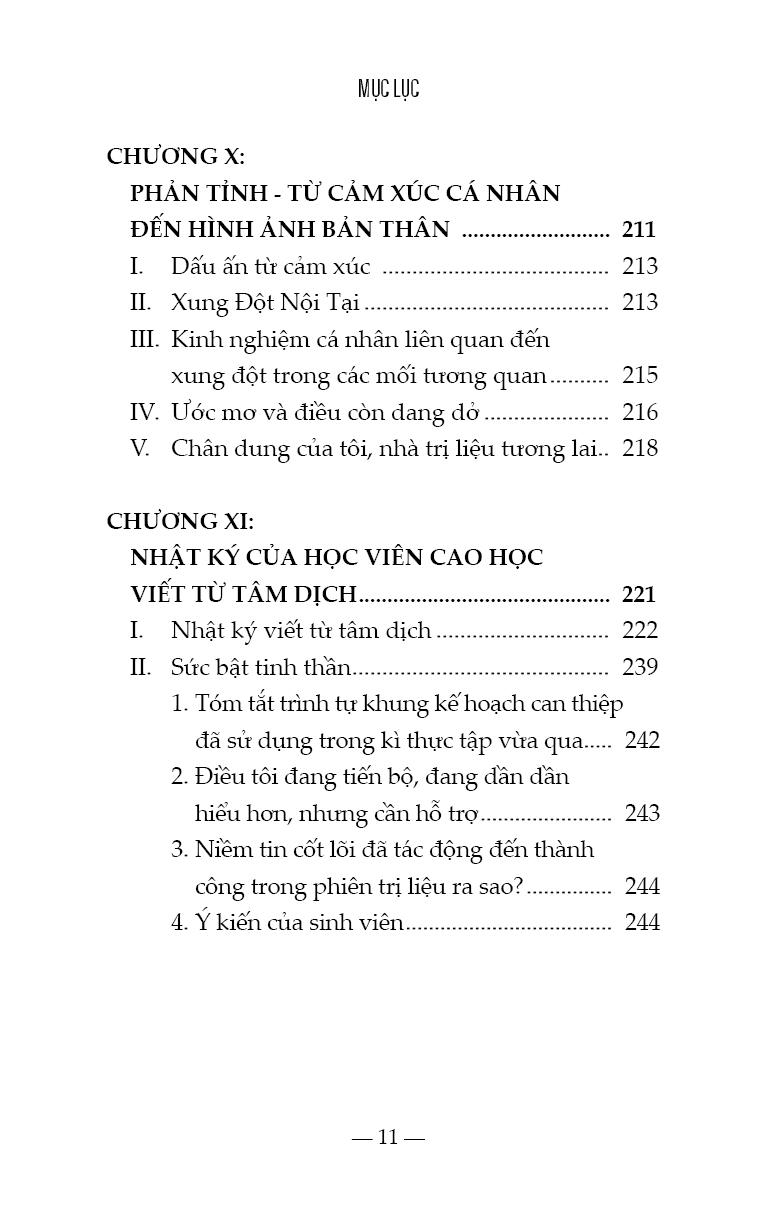 - đào tạo nhà trị liệu tương lai trở thành người lắng nghe thấu cảm, biết nhạy bén để nhận thức được nhu cầu của bản thân và của người khác, hầu có thể xây dựng sự an toàn, tôn trọng, cẩn mật, kiên nhẫn…. Nhà trị liệu tương lai cần ý thức rõ không những điểm mạnh mà cả điểm yếu của bản thân, khả năng nhìn ra ánh sáng nơi tăm tối, đọc được những gì không được nói ra bằng lời của tha nhân, người vừa biết cởi mở để lắng nghe với sự hiện diện ấm áp, an toàn, đồng thời thể hiện được tính chuyên nghiệp, tính bảo mật, trong khi đó biết chia sẻ thông tin đúng lúc, biết ghi chú những dịch chuyển của thân chủ trong phiên trị liệu và biết lưu giữ hồ sơ lâm sàng, người lưu tâm đến vấn đề đạo đức, nhạy bén để trao quyền cho thân chủ, nhưng không tìm cách thoái thác trách nhiệm, người có khả năng biết tự chăm sóc và hài lòng với những gì mình đã làm tốt nhất. Đây là nỗ lực của học viên để chia sẻ với các lớp sau, những suy tư được kết nối giữa cơ sở lý thuyết tâm lý với kinh nghiệm sống rất cá nhân, những gập ghềnh và những thành tựu trên hành trình trở thành nhà trị liệu tương lai. Chúng tôi trân trọng gửi đến người đọc tập sách này, được chắt lọc từ suy tư của học viên cao học, liên quan đến môn thực hành tâm lý lâm sàng. Sách đã được người hướng dẫn phản hồi, góp ý, ghi nhận và hiệu đính. Vì mục tiêu của tập sách này là chia sẻ kinh nghiệm học thuật, dưới sự hướng dẫn của giám sát chuyên môn, nên chúng tôi biết ơn sự trân trọng của độc giả. TPHCM, ngày 04/10/2022 Tiến sĩ Nguyễn Thị Thanh Tú, Fmm