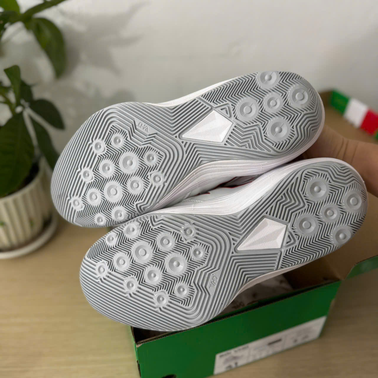 Đế ngoài bằng cao su non tổng hợp chất liệu với các ưu điểm là bám mặt sân rất tốt, tạo cảm giác an toàn và nhanh nhạy trong khi di chuyển + đặc biệt chất liệu cao su non cao cấp giúp giày có độ bền khá tốt ngay cả khi chơi bóng trên sân betong