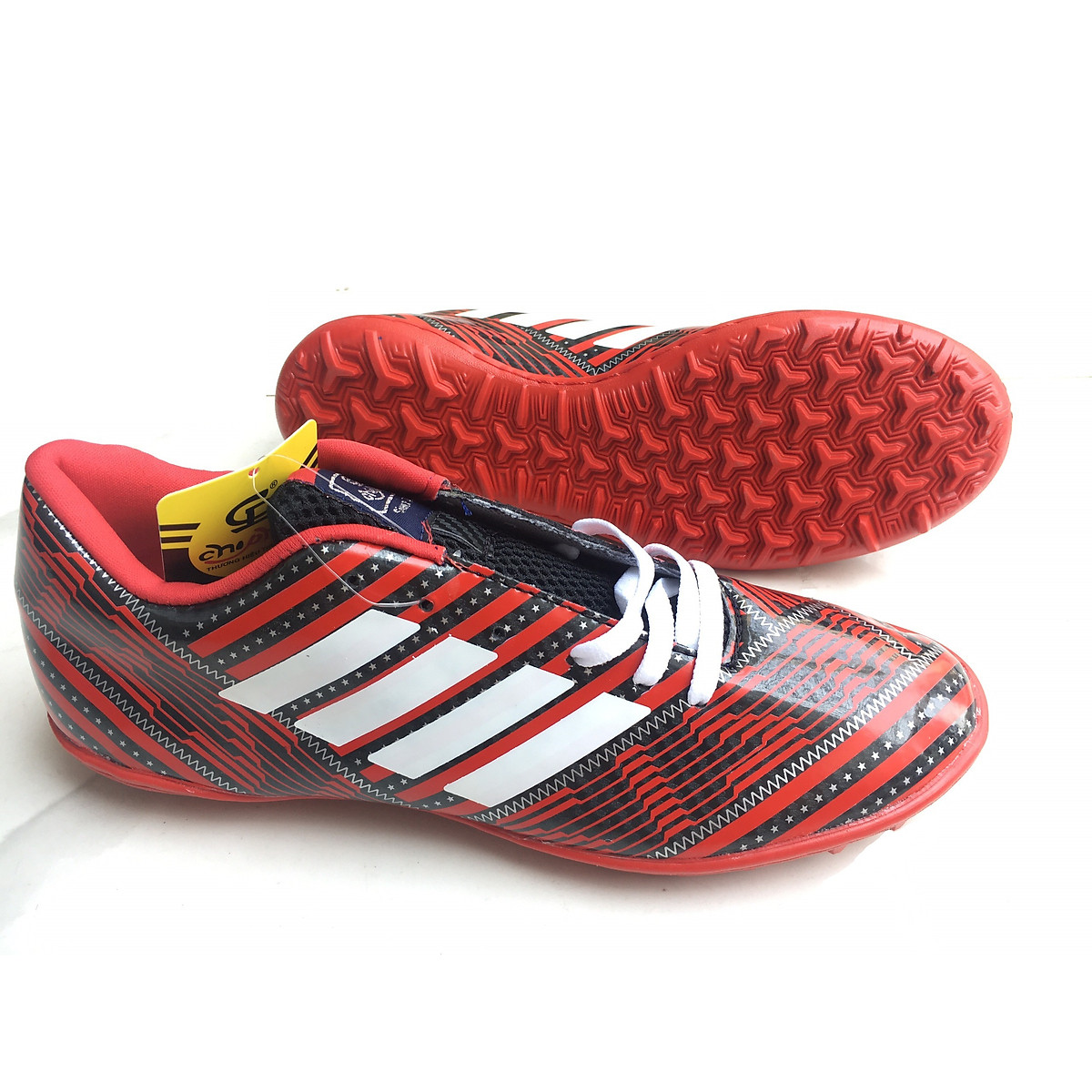 Giày Đá Bóng được làm theo tiêu chuẩn sân cỏ Việt Nam, chất liệu đế từ cao su thiên nhiên, bề mặt giày được tạo bởi chất da nhân tạo có độ bóng chống thấm nước, chống bám bẩn cho bạn một đôi giày hoàn hảo khi hoạt động thể thao. Ngoài ra với lớp đinh có độ cao nhỏ theo hình tròn còn hỗ trợ người chơi có đà tăng tốc tốt hơn.