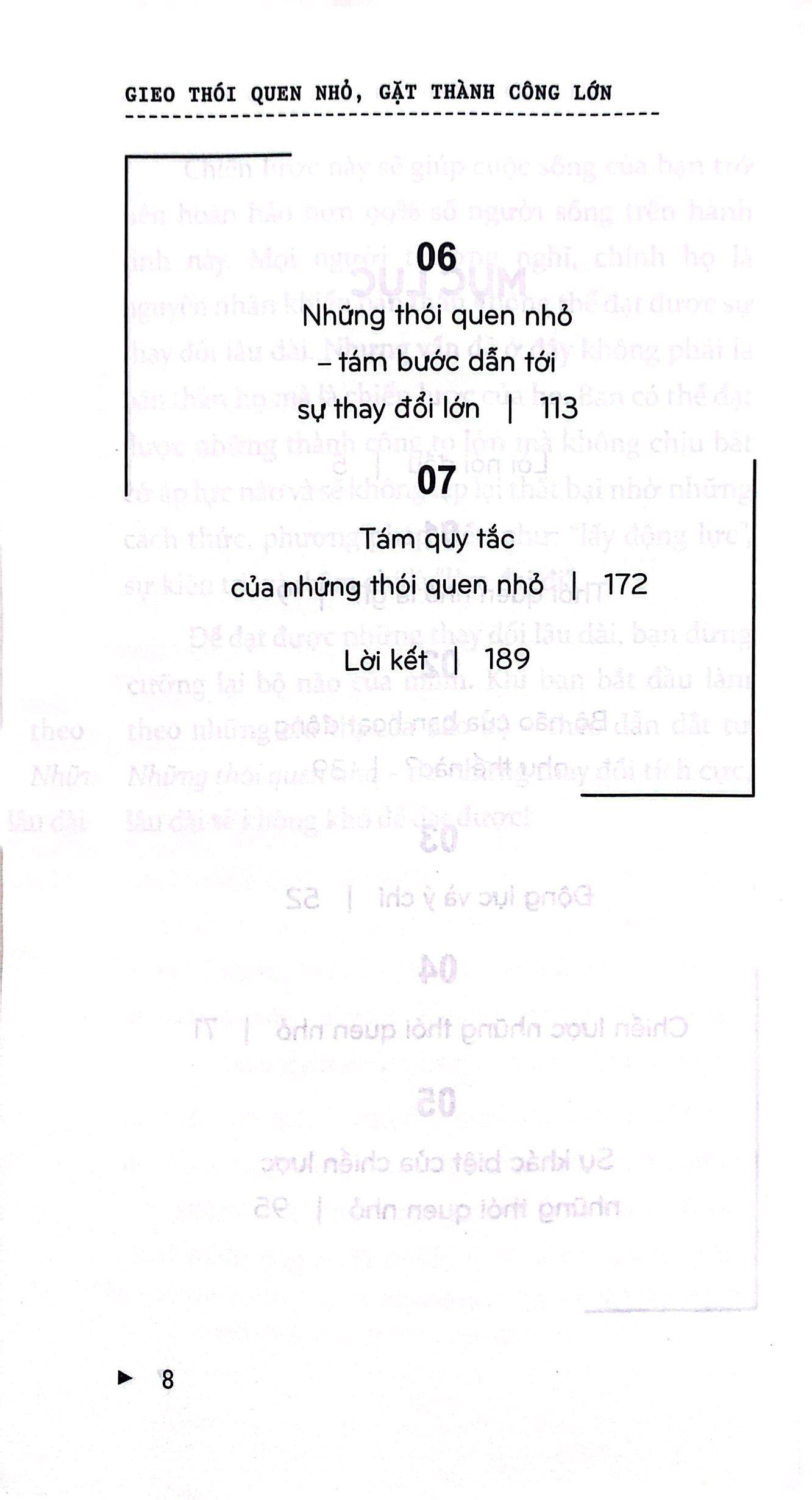 Mọi người thường nghĩ, chính họ là nguyên nhân khiến bản thân không thể đạt được sự thay đổi lâu dài. Nhưng vấn đề ở đây không phải là bản thân họ mà là chiến lược của họ. Bạn có thể đạt được những thành công to lớn mà không chịu bất cứ áp lực nào và sẽ không lặp lại thất bại nhờ những cách thức, phương pháp kiểu như: “lấy động lực”, sự kiên trì, và thậm chí là “làm đại đi”. Để đạt được những thay đổi lâu dài, bạn đừng cưỡng lại bộ não của mình. Khi bạn bắt đầu làm theo những chỉ thị của não bộ – theo dẫn dắt từ Gieo thói quen nhỏ, gặt thành công lớn – thì những thay đổi tích cực, lâu dài sẽ không khó để đạt được!