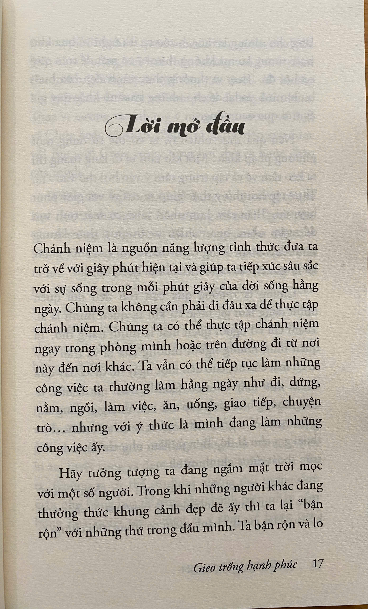 Gieo trồng hạnh phúc không chỉ mang đến những ý niệm tươi mới về bản thân mỗi người mà còn giúp mỗi người trân trọng và lắng nghe hơi thở của mình, thúc đẩy họ vượt qua, rũ bỏ những ham muốn tiêu cực khỏi đời sống vốn đòi hỏi lòng từ bi, nhắc nhở con người quay về sống với tình yêu thương.