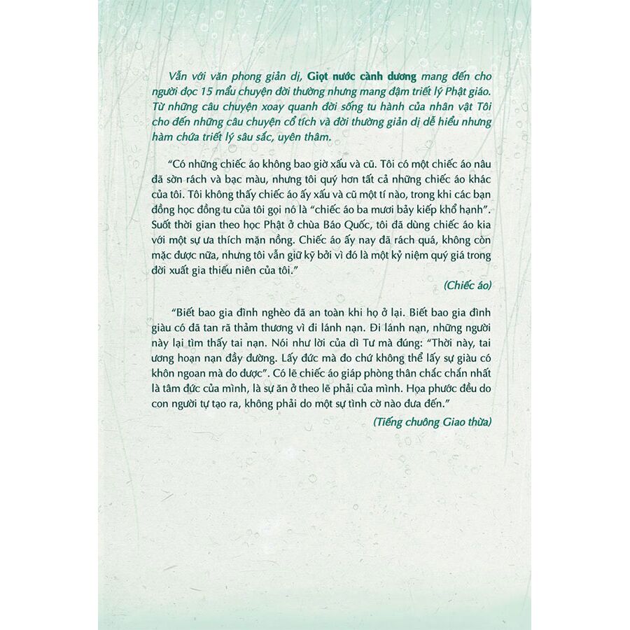 Vẫn với văn phong giản dị, Giọt Nước Cành Dương mang đến cho người đọc 15 mẩu chuyện đời thường nhưng mang đậm triết lý Phật giáo. Từ những câu chuyện xoay quanh đời sống tu hành của nhân vật Tôi cho đến những câu chuyện cổ tích và đời thường giản dị dễ hiểu nhưng hàm chứa triết lý sâu sắc, uyên thâm.