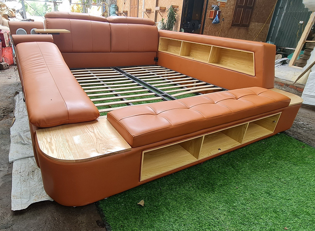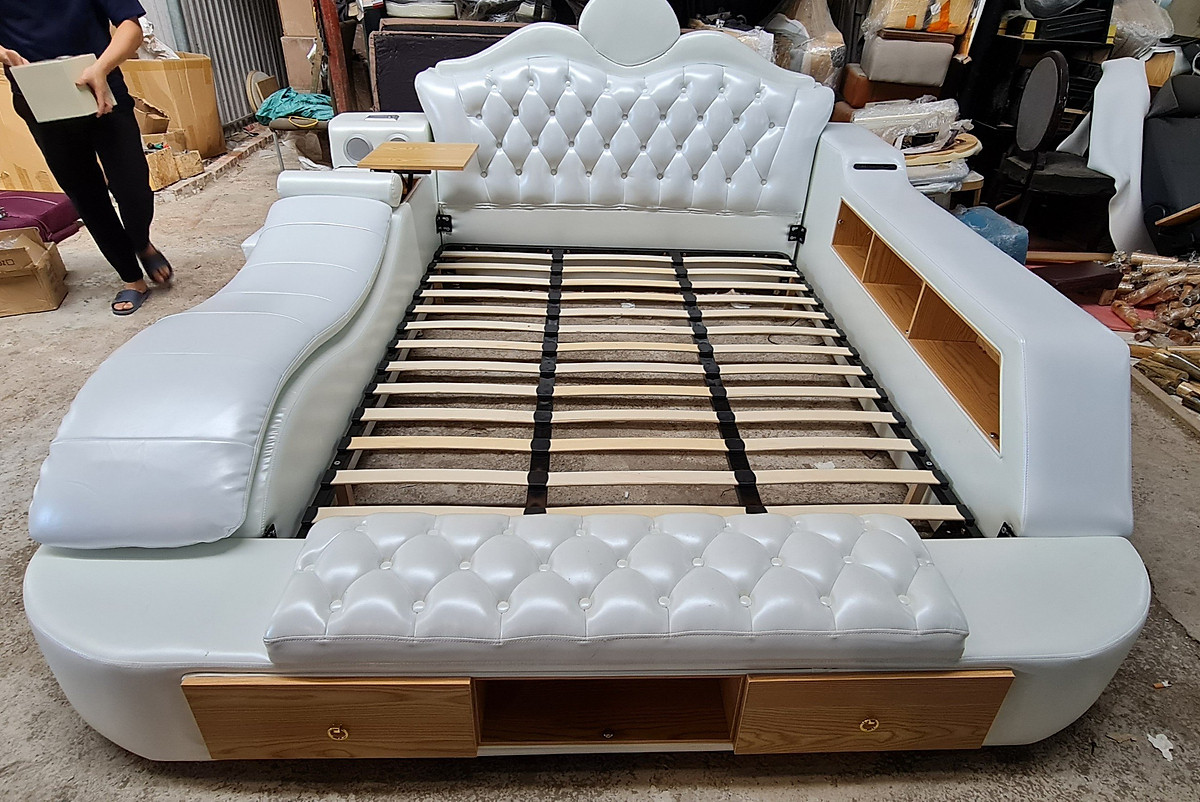 Giường ngủ massage đa năng có thể sủ dụng thành đọc sách, hộc đứng đồ, loa, két sắt tiện lợi. Với thiết kế thông minh tạo nên cảm giác sang trọng, tiện nghi cho không gian căn phòng.