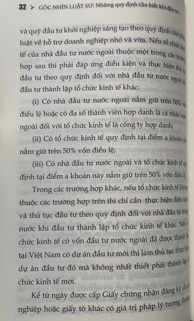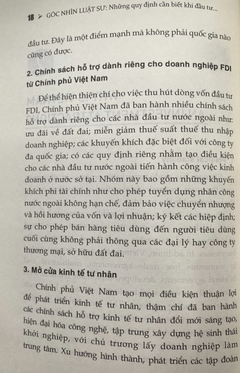 GÓC NHÌN LUẬT SƯ (song ngữ) Những quy định cần biết khi đầu tư vào Việt Nam ThS. Luật sư Lê Thị Dung Nxb Chính trị Quốc gia Sự thật Công ty phát hành: Nxb Chính trị Quốc gia Sự thật Số trang: 287 Kích thước: 16x24 cm Cân nặng: 300gr Hình thức: Bìa mềm Phát hành: 11.2022 Đây là cuốn sách chứa toàn bộ những kiến thức pháp lý liên quan đến lĩnh vực đầu tư nước ngoài vào Việt Nam. Mang giá trị thiết thực cho các nhà đầu tư nước ngoài đang tìm kiếm cơ hội đầu tư vào quốc gia này.” - Ông Hong Sun - Phó Chủ tịch Hiệp hội Korcham. Cuốn sách là sự tổng hợp các quy định pháp luật mới nhất liên quan đến pháp luật đầu tư bao gồm: Luật đầu tư, Luật dân sự, Luật doanh nghiệp, Luật lao động, Luật bảo hiểm xã hội, Luật thuếà kèm theo đó là sự phân tích của tác giả giúp bạn đọc nhanh chóng nắm được các khái niệm, kiến thức, quy định pháp luật liên quan đến đầu tư doanh nghiệp. Nội dung gồm 17 phần được sắp xếp một cách khoa học trình bày toàn diện pháp luật đầu tư từ việc giải thích nhà đầu tư là ai, các loại hình doanh nghiệp được phép đầu tư, các ưu đãi, ngành nghề được phép đầu tư, các thủ tục cần thiết trước và sau đầu tư cũng như trình bày về thuế, kiểm toán, nhượng quyền thương mại, giải thể, lao động nước ngoài, bảo hiểm xã hội, quản lý mối quan hệ nhân sự.   Nội dung sách bao gồm 17 mục bao quát toàn bộ lĩnh vực pháp luật đầu tư: