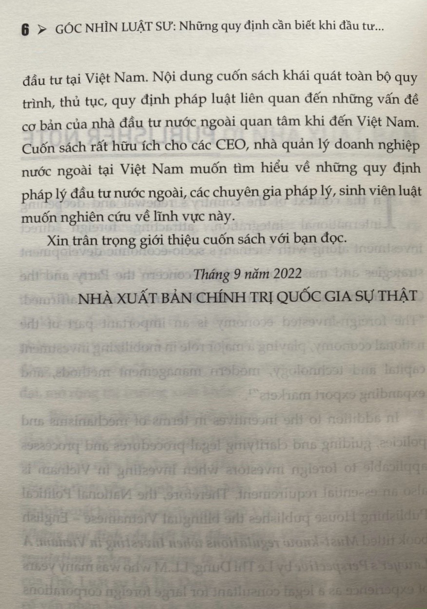 GÓC NHÌN LUẬT SƯ (song ngữ) Những quy định cần biết khi đầu tư vào Việt Nam ThS. Luật sư Lê Thị Dung Nxb Chính trị Quốc gia Sự thật Công ty phát hành: Nxb