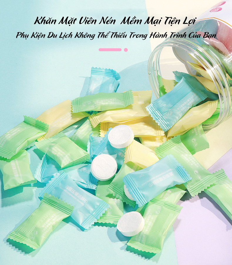 KHĂN GIẤY NÉN RỬA MẶT DẠNG VIÊN KẸO HÀN QUỐC, KHĂN NÉN ƯỚT DẠNG VIÊN Thông tin sản phẩm - Kích thước GIẤY NÉN VIÊN KẸO : 20x22cm - Chất liệu: Sợi vải dài -