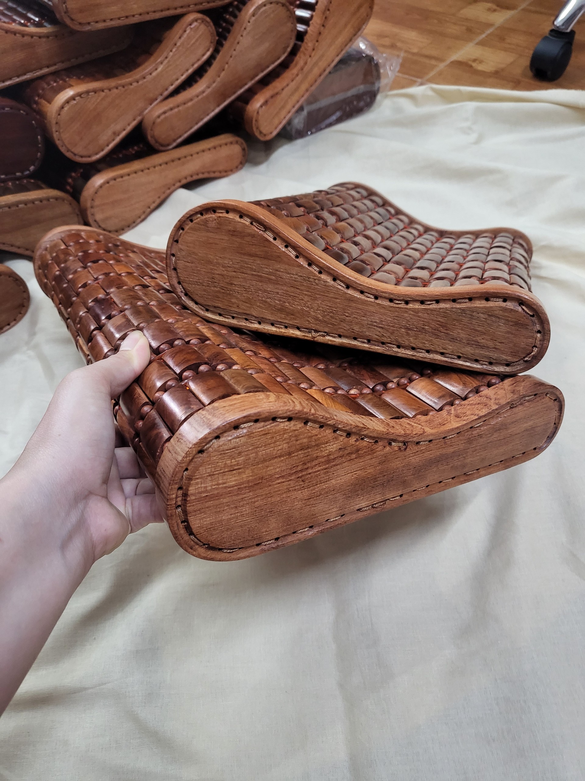 - Chất liệu : Gỗ Hương tự nhiên Hạt gỗ rắn chắc , có mùi thơm nhẹ , những hạt gỗ chọn và nhặt tỉ mỉ trong quá trình đan gối .