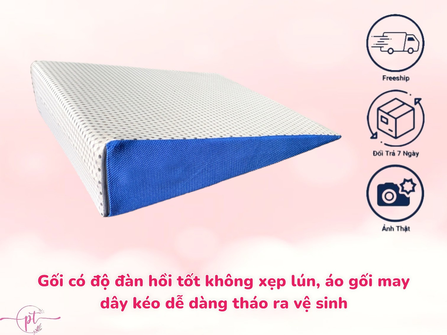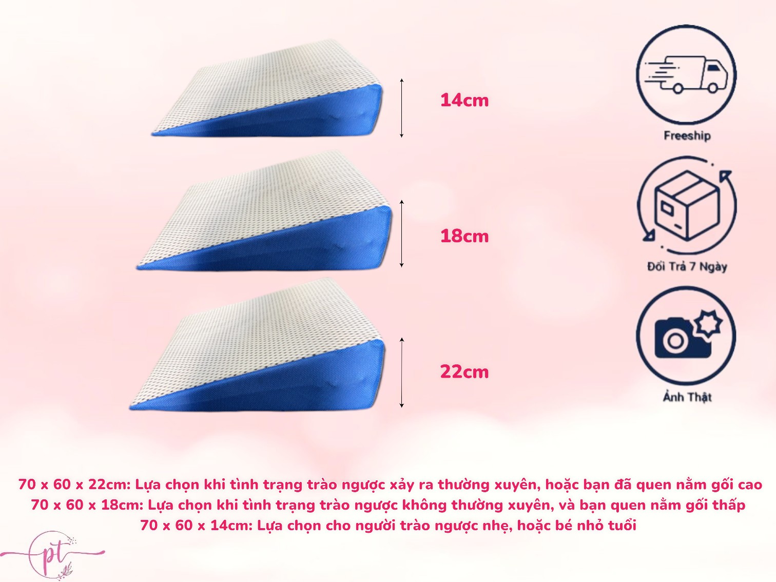 CAM KẾT: Cam kết đổi trả nếu hàng không giống mô tả và hoàn tiền 100% nếu sản phẩm lỗi. ────()()()────()()()──── Với hiết kế chuẩn của dòng gối chống trào ngược, hỗ trợ cân bằng đốt sống cổ một cách tự nhiên, giúp người nằm không bị cảm giác đau nhức vai gáy, hay bị giảm tuần hoàn máu lên não dẫn đến tình trạng mệt mỏi sau khi sử dụng sản phẩm. 3 tùy chọn độ cao đem lại góc nằm nghiêng khoa học phù hợp với thể trạng người Việt Nam, từ đó mang lại hiệu quả cao trong việc giảm tình trạng trào ngược dạ dày, nóng rát và cảm giác vướng ở cổ họng Hãy để gối chống trào ngược bên shop với thiết kế đúng CHUẨN Y TẾ KHUYẾN CÁO (70 x 60 x 18cm và 70 x 60 x 22cm) giúp bạn giảm thiểu và ngăn ngừa tình trạng trên nhé! Kích thước 70 x 60 x 14cm: Lựa chọn cho người trào ngược nhẹ, hoặc bé nhỏ tuổi. Kích thước 70 x 60 x 18cm: Lựa chọn khi tình trạng trào ngược không thường xuyên, và bạn quen nằm gối thấp. Kích thước 70 x 60 x 22cm: Lựa chọn khi tình trạng trào ngược xảy ra thường xuyên, hoặc bạn đã quen nằm gối cao. Cấu tạo sản phẩm: Lớp vỏ lưới bảo vệ 5D. Lớp vải thun lạnh mềm mại. Ruột gối Latex Foam. Sử dụng chất liệu Latex Foam được khử khuẩn, cho độ đàn hồi và thoải mái cao, thoáng khí hơn với thiết kế lỗ thông hơi lớn nhỏ. Lớp vỏ lưới bảo vệ 5D với thiết kế sợi đan xen độc đáo, mang lại cảm giác thông thoáng, không hầm bí, không trơn trượt khi nằm. Sản phẩm hoàn toàn không mùi, an toàn cho sức khỏe người nằm.