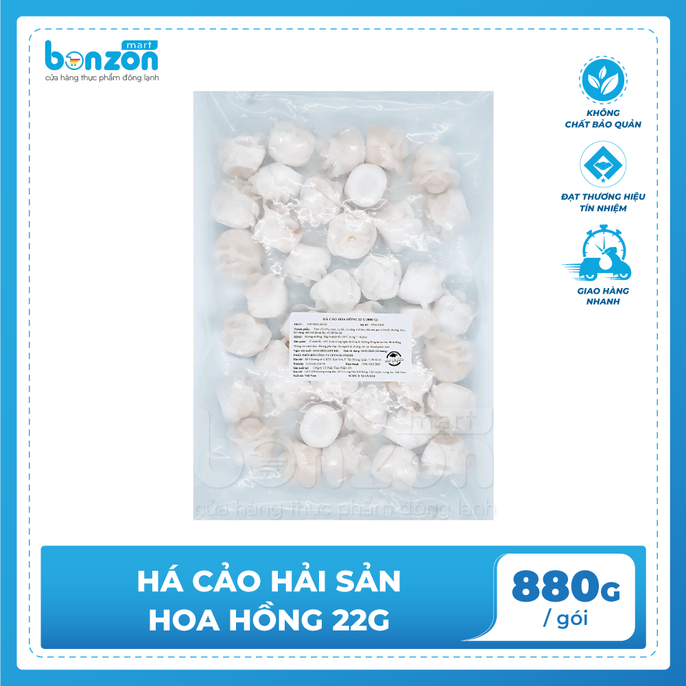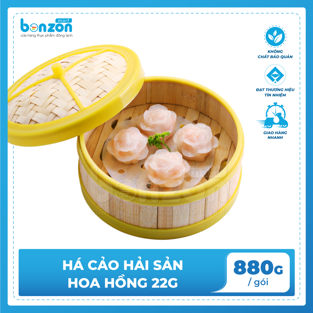 Với sản phẩm tươi sống, trọng lượng thực tế có thể chênh lệch khoảng 10%. ĐỊNH LƯỢNG: 22g/cái x 40 cái/gói (1 gói 880gr ) THÀNH PHẦN: Vỏ bột há cảo, tôm, mực, cá hồi, củ năng, mỡ heo, gia vị MÔ TẢ SẢN PHẨM: - Vỏ áo ngoài màu trắng trong - Bánh được định hình hình hoa hồng, vỏ bánh mỏng, mềm mịn dẻo dai với phần nhân từ tôm, mực, cá hồi và củ năng xay nhuyễn mang đến vị ngọt tự nhiên CÁCH CHẾ BIẾN: - Không rã đông - Hấp 100°C, 6-7 phút - Microwave ở chế độ hấp: 3-4 phút BẢO QUẢN: - Bảo quản nhiệt độ -15°c đến -18°c hoặc trong ngăn đá tủ lạnh - Không đông lại sau khi đã rã đông HSD: 12 tháng