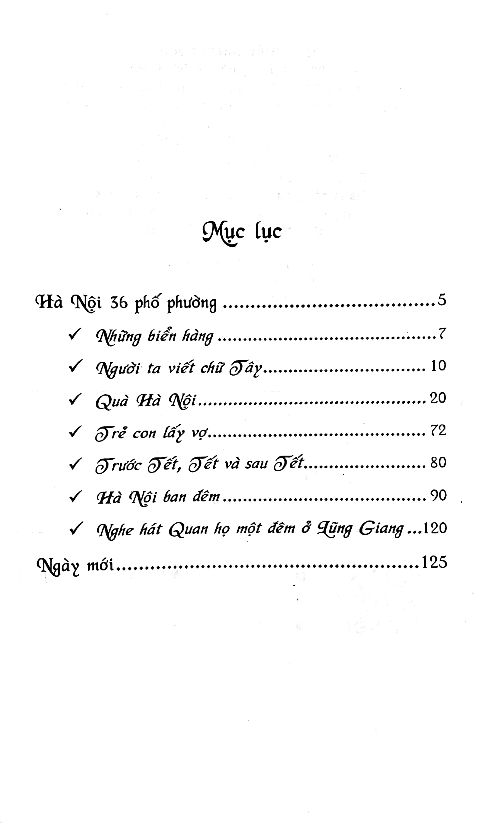 Hà Nội 36 phố phường chủ yếu viết về chuyện phố, chuyện phường, đời sống dân sinh, đặc biệt là đi sâu vào những thức quà chỉ riêng nơi đây mới có. Hơn 20 bài kí nhỏ như hai mươi bức họa đầy hoài niệm, dựng nên hình bóng Hà Nội xưa. Ta sẽ bắt gặp nhiều cảnh đời qua những mẩu chuyện ngắn hết sức xúc động. Họ là những người phụ nữ tần tảo, sống một cuộc đời lầm lũi, vất vả với gánh nặng cơm áo gạo tiền. Bên cạnh đó, thấp thoáng giữa các số phận éo le, ẩn hiện tình yêu đôi lứa trong sáng và thuần khiết.