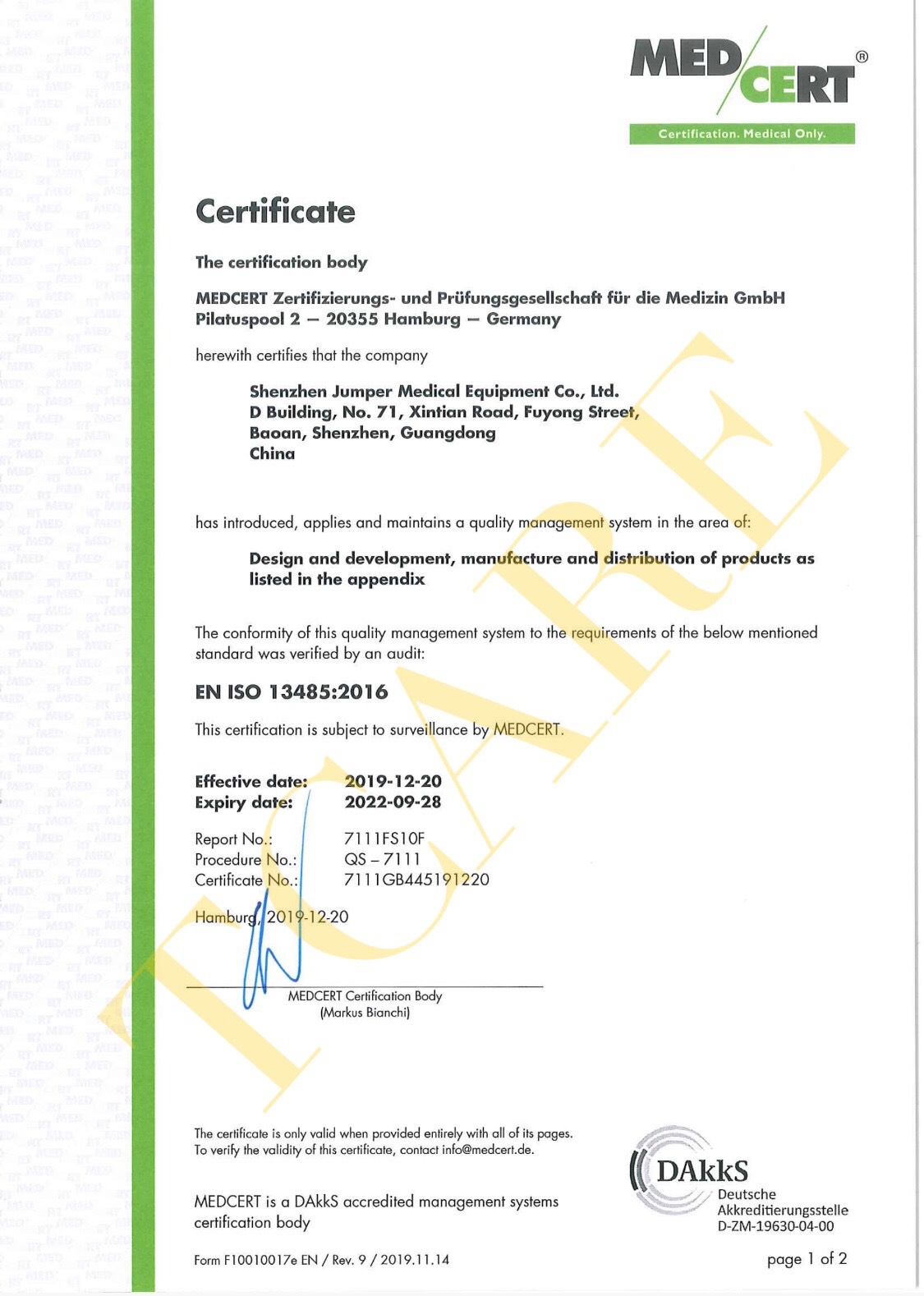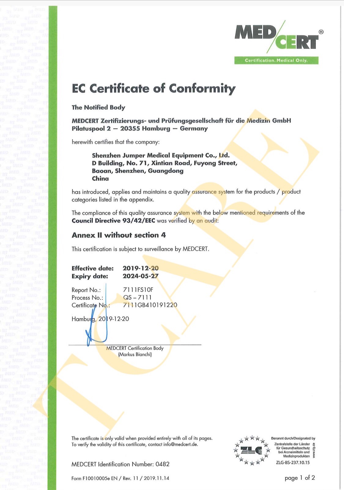 Jumper thực hiện kiểm soát chặt chẽ chất lượng sản phẩm thông qua hệ thống ISO 13485:2003, và các sản phẩm đã đạt các chứng nhận nổi tiếng khắt khe nhất thế giới như FDA, CE, SGS, CMDCAS, INMETRO, CFDA… Sản phẩm của Jumper được xuất khẩu sang hơn 70 quốc gia. Jumper Medical sở hữu hơn 100 bằng sáng chế và bản quyền liên quan đến thiết bị y tế và 3 trung tâm nghiên cứu và phát triển sản phẩm tại châu Âu và Mỹ.