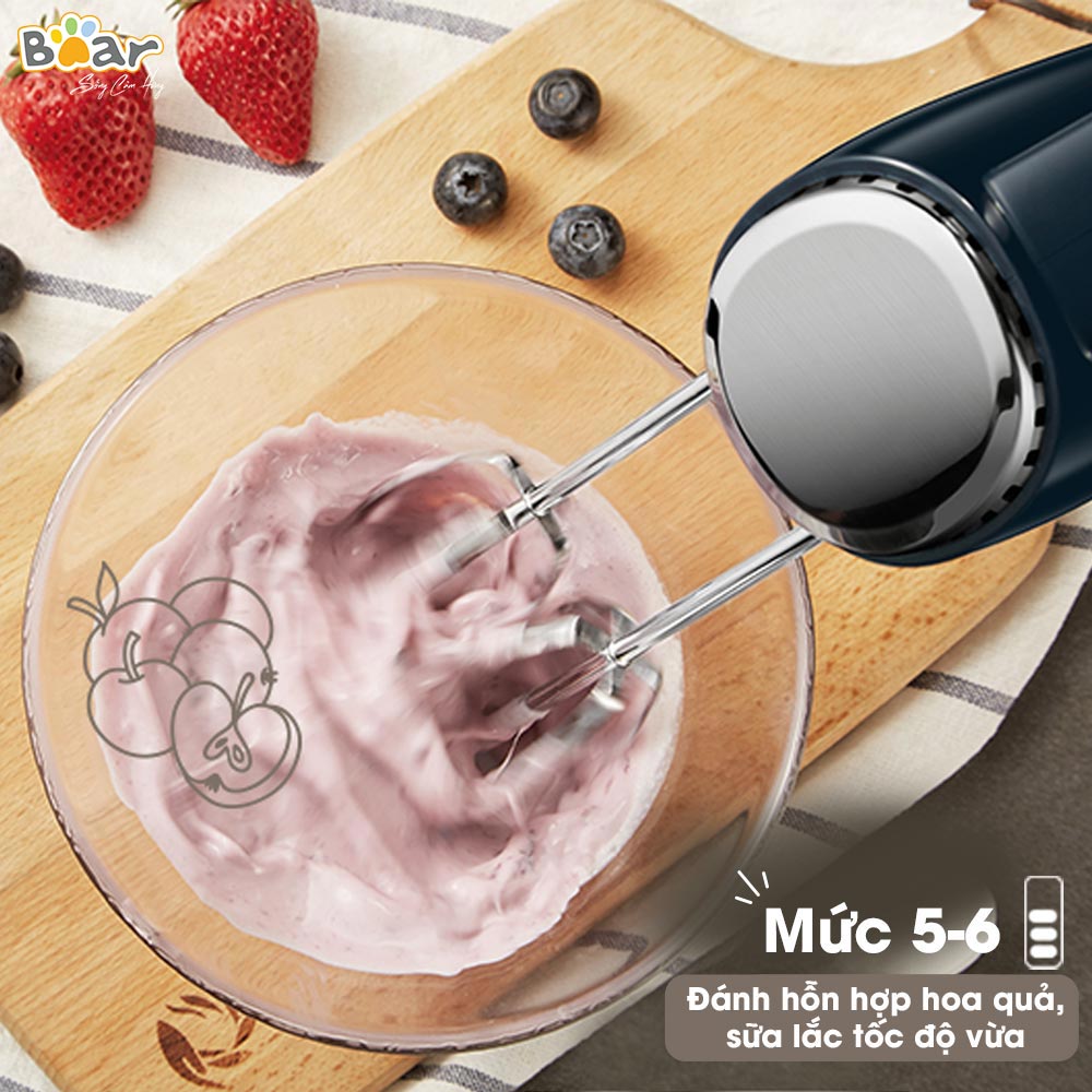 - Chẳng hạn, với chức năng đánh trứng, đánh kem, máy đánh trứng cầm tay Bear sẽ giúp bạn đánh bông, đánh cứng kem tươi và lòng trắng trong thời gian ngắn nhất. Bạn có thể tham khảo các bước đánh kem hoặc đánh lòng trắng trứng theo các clip hướng dẫn. Tuy nhiên, hãy nhớ rằng, mỗi loại bánh sẽ có những yêu cầu khác nhau về chất lượng kem hay chất lượng kem lòng trắng trứng. Ví dụ: Với bánh bông lan, lòng trắng trứng đạt là cứng lại, có chóp nhọn khi nhấc que đánh ra khỏi hỗn hợp được đánh bông. Tuy nhiên, đối với bánh macaron, yêu cầu về mức độ bông của lòng trắng trứng chỉ là bông, xốp, mềm mại và không được quá cứng hay có chóp nhọn. Do đó, khi đã sử dụng máy đánh trứng cầm tay Bear, bạn nên làm thật nhiều loại bánh, sau đó, rút ra những kinh nghiệm từ những lần đó và ghi vào sổ. Chắc chắn, bạn sẽ thành công.