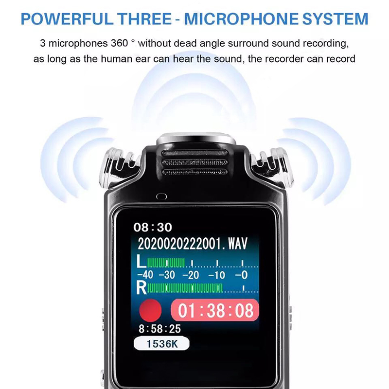 Chất liệu vỏ: Hợp kim kẽm Màn hình: Màn hình màu TFT 1,44 inch Định dạng ghi âm và tốc độ lấy mẫu: Định dạng WAV (32Kbps-1536Kbps) Chất lượng ghi âm: WAV 512Kbps (mặc định)