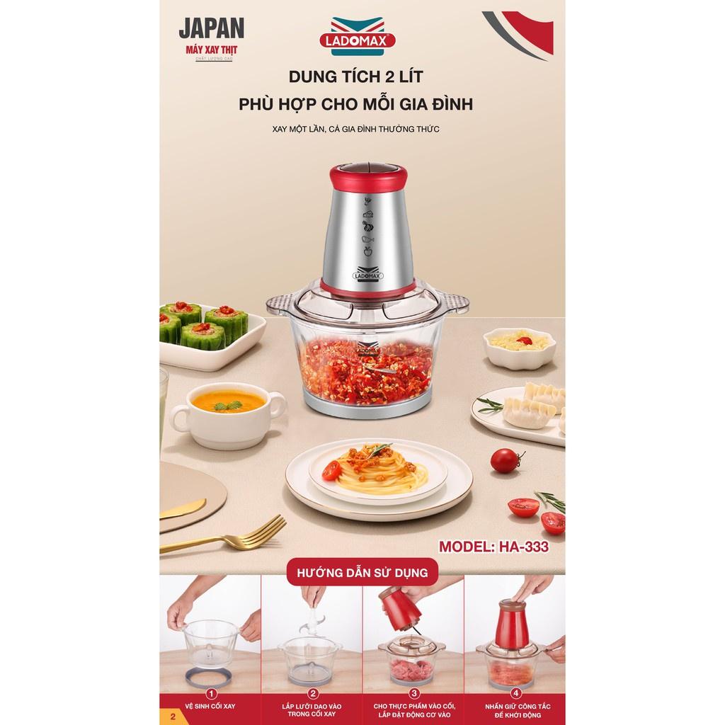 Thông tin sản phẩm - Tên sản phẩm: MÁY XAY THỊT ĐA NĂNG - Thương hiệu: LADOMAX - Model: HA-333 - Điện áp: 220V - 50Hz - Dung tích: 2L - Công suất: 400W -
