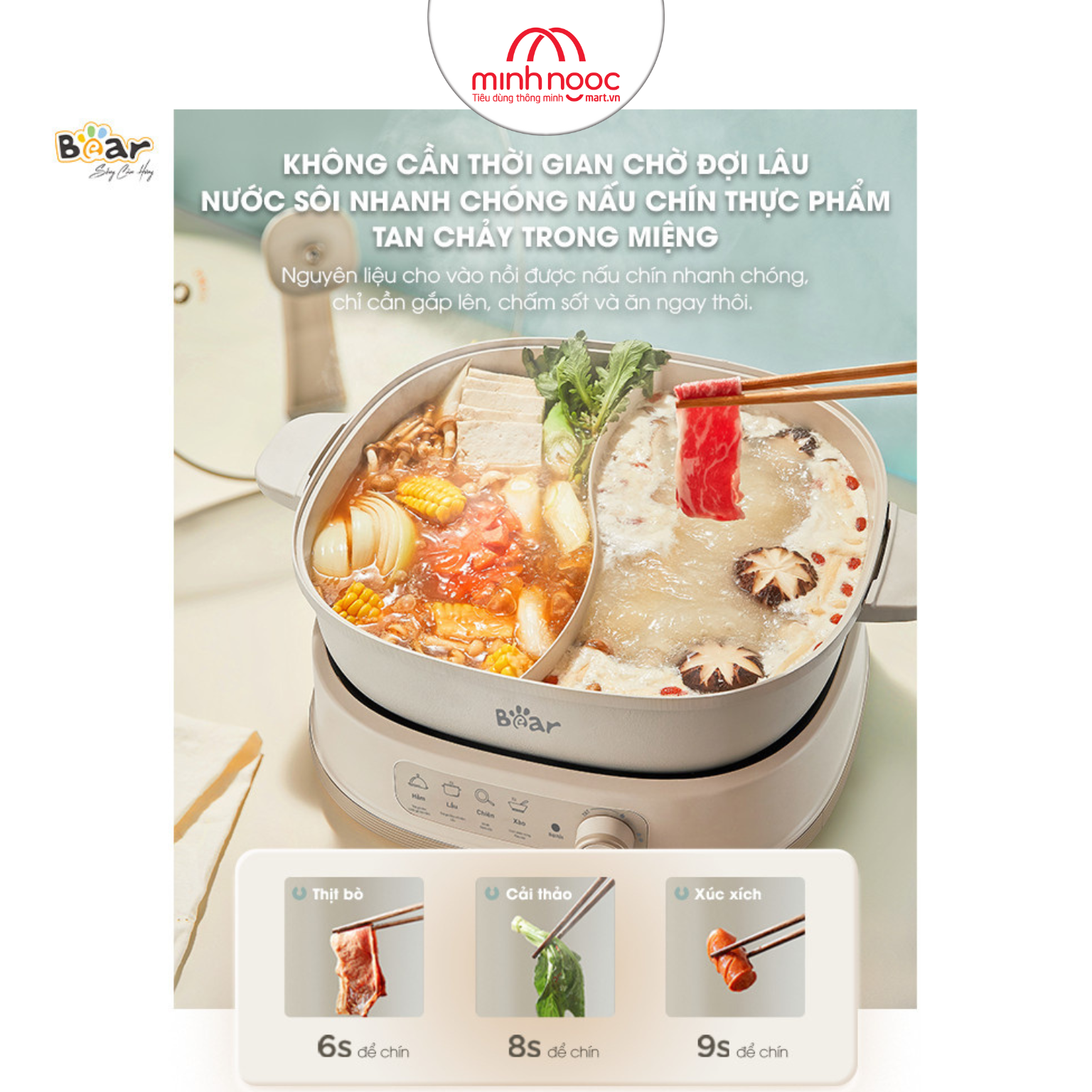 – Công suất hoạt động mạnh mẽ: Nồi lẩu Bear 2 ngăn có công suất hoạt động lên đến 1600W, kết hợp ống sinh nhiệt kép được đặt ở dưới đáy nồi giúp cho nhiệt lượng tập trung và gia tăng, giúp nước đun sôi nhanh chóng trong vòng 8 phút