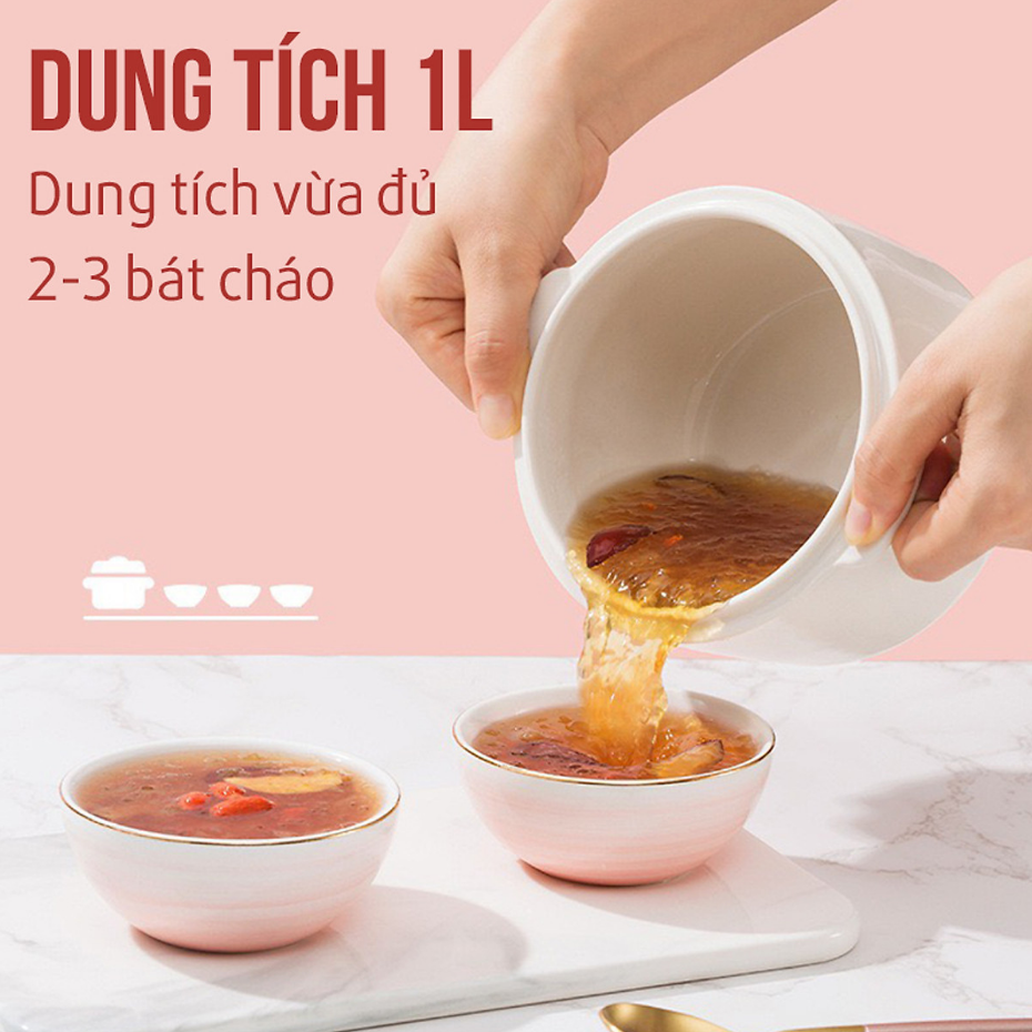 Nồi hầm cách thủy. Nồi nấu cháo dung tích 1L, lòng nồi bằng sứ giữ nhiệt tốt nồi chưng yến, nồi canh
