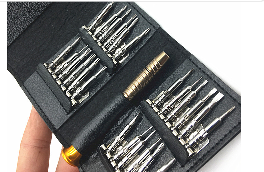 Với bộ tua vít 25 in 1 này đảm bảo bạn sẽ không còn phải lo lắng sửa chữa đồ điện tử khi gặp phải những con ốc, vít siêu nhỏ. Bộ tô vít ví da25in1mang lại cho bạn nhiều tiện lợi khi sửa chữa máy móc hay các thiết bị điện tử cỡ nhỏ trong gia đình. Bộ tua vít với đầu tua vít được làm từ chất liệu thép không gỉ nên rất bền chắc. Sản phẩm có nhiều kiểu đầu vít khác nhau như: đầu dẹt, tam giác, lục giác, 3 cạnh, 4 cạnh, 5 cạnh và 6 cạnh, mỗi dạng đều có đủ các cỡ từ lớn đến nhỏ nên rất dễ dàng cho bạn trong việc sửa chữa đồ đạc.