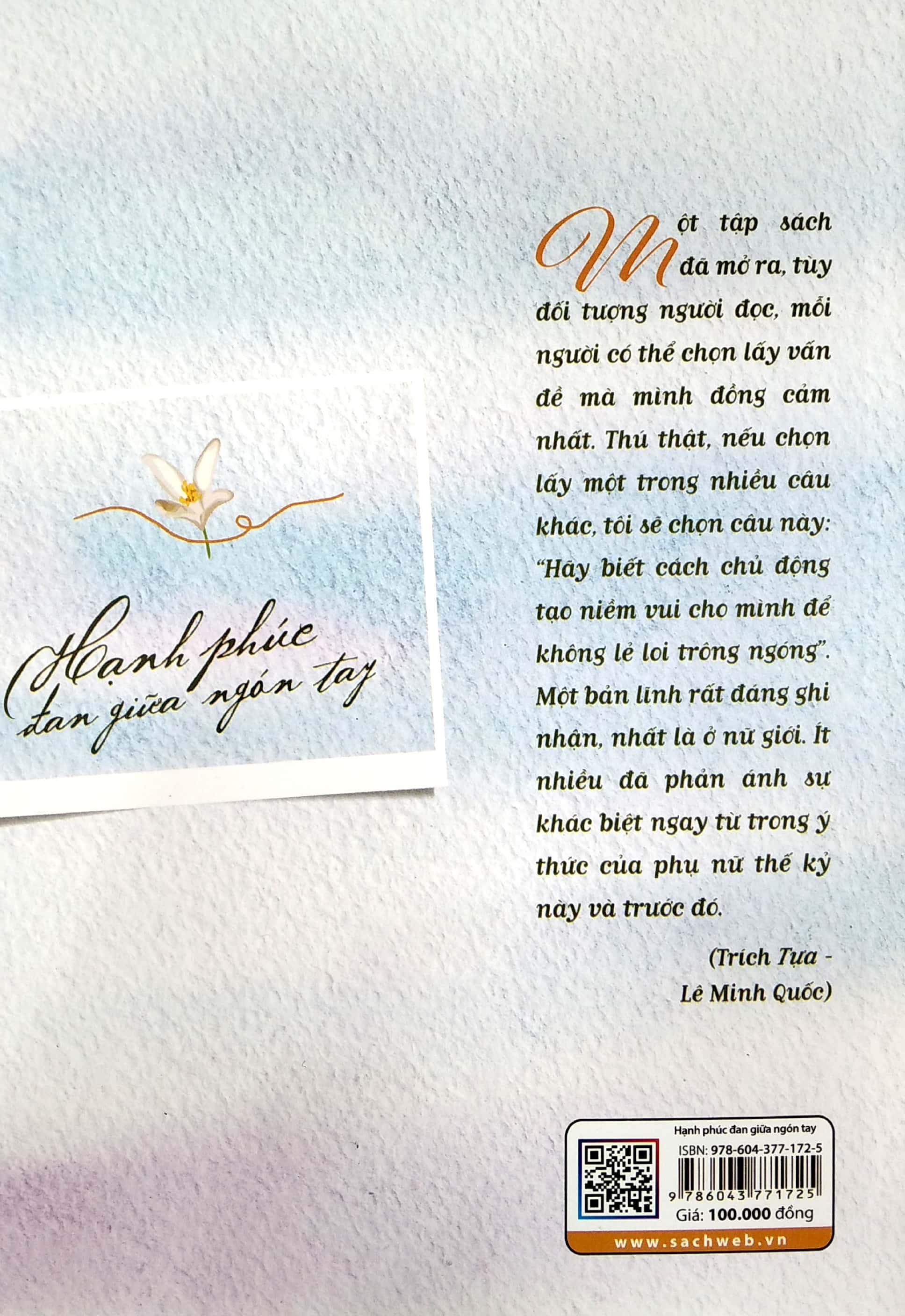 Hạnh Phúc Đan Giữa Ngón Tay của tác giả Minh Hương. Nguyễn là quyển sách viết theo tâm thế “Trong đời sống này, sự khổ đau hay sung sướng, hoan lạc hay sầu thảm cũng