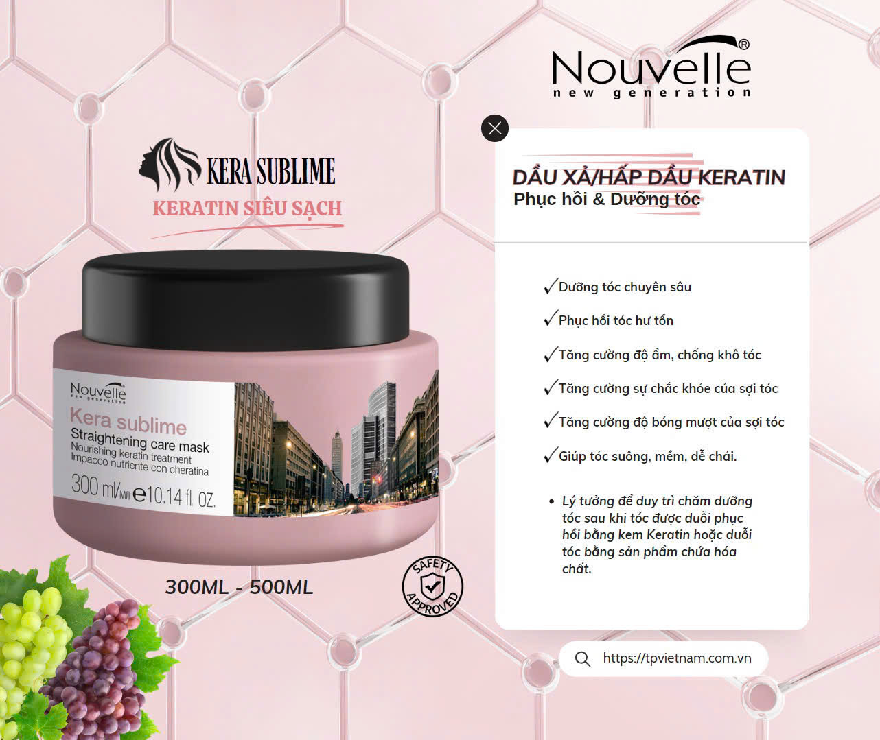 Mua tại TiktokCông dụng: Nuôi dưỡng tóc, cân bằng độ ẩm, tăng cường sự chắc khỏe và bóng mượt cho tóc nhờ sự hoạt động hiệu quả của sự kết hợp các thành phần keratin và tinh dầu hạt nho trong sản phẩm. Giúp tóc suông mềm và dễ chải. Cách sử dụng:Sau khi gội đầu, lau ráo tóc, thoa sản phẩm lên tóc, chải tóc cho sản phẩm phân bố đều, để khoảng 3 - 5 phút rồi xả sạch. Dung tích: Hũ 500ml