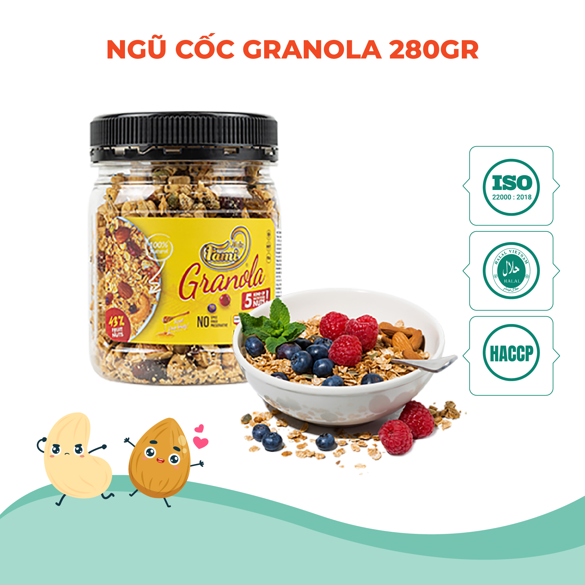 NGŨ CỐC GRANOLA là một món ăn quen thuộc của người Mỹ vào mỗi buổi sáng, là hỗn hợp của nhiều thực phẩm lành mạnh có hàm lượng chất dinh dưỡng cao, giàu protein.Bao gồm các loại hạt dinh dưỡng, yến mạch, trái cây khô sử dụng công nghệ nướng giòn không chiên.