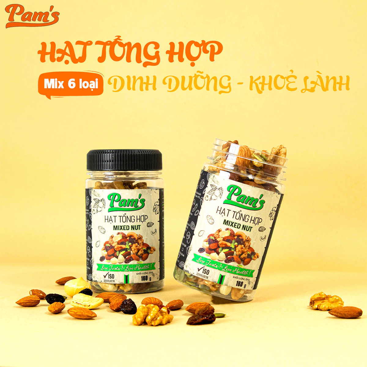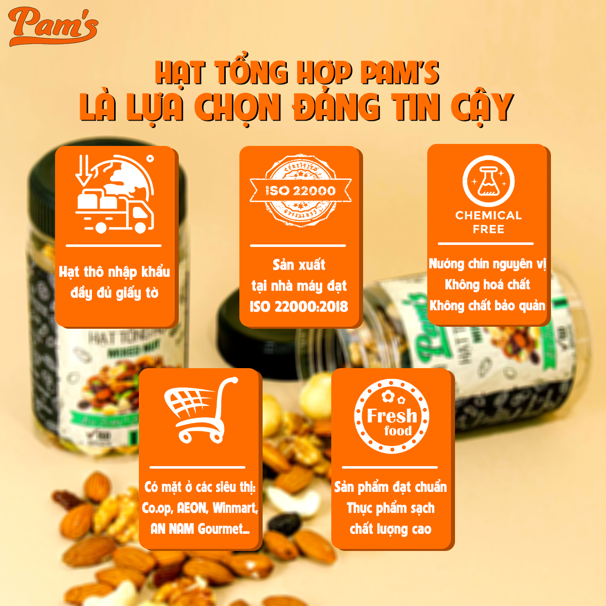 - 100g Hạt tổng hợp Pam's cung cấp: 640 Calo, 54g Chất Béo, 22g Carbs, 15g Protein, 100mg Canxi, 4.1mg Sắt.