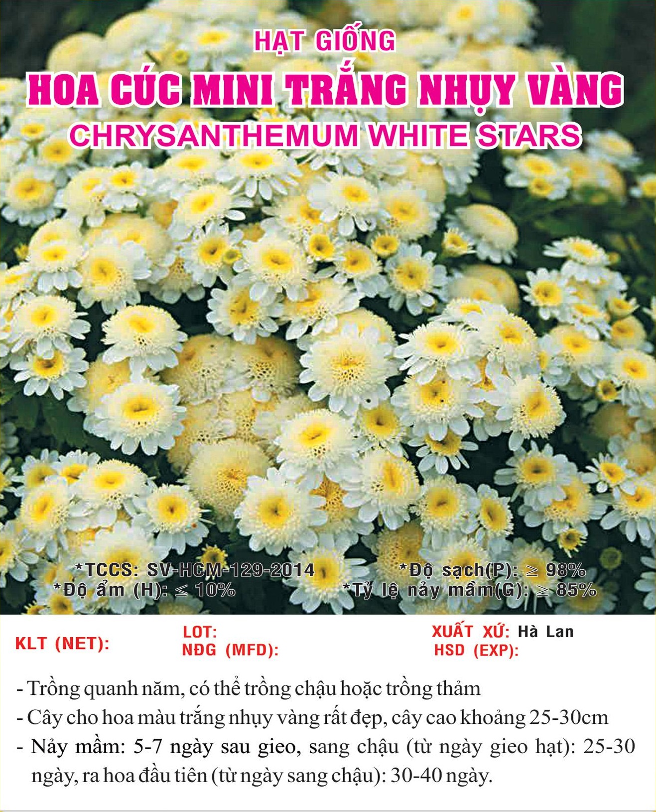 - Đặc tính giống: Cúc Mini Trắng Nhụy Vàng cho hoa sau 70-80 ngày. Cây cao 25-30cm, hoa có màu trắng nhụy vàng rất đẹp. Cúc Mini Trắng phù hợp với khí hậu nhiệt đới, có thể trồng chậu, trồng cắt cành hoặc trồng thảm.