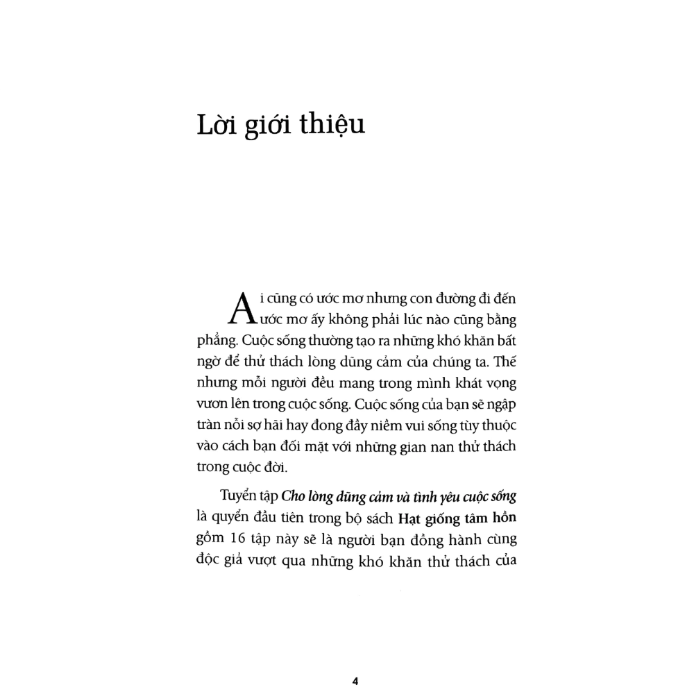 Cho Lòng Dũng Cảm Và Tình Yêu Cuộc Sống trong bộ sách Hạt giống Tâm hồn này sẽ là người bạn đồng hành cùng người đọc vượt qua những khó khăn thử thách trong cuộc sống thường ngày như nỗi mất mát, nỗi đau tổn thương tinh thần, bệnh tật, những thăng trầm trên bước đường theo đuổi ước mơ của cuộc đời.